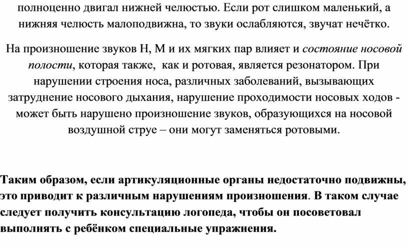 Поскольку для произношения очень важен объём ротовой полости – резонатора, в котором происходит образование большинства звуков, то здесь важно, чтобы ребёнок достаточно широко открывал рот, а также активно и полноценно двигал нижней челюстью. Если рот слишком маленький, а нижняя челюсть малоподвижна, то звуки ослабляются, звучат нечётко.