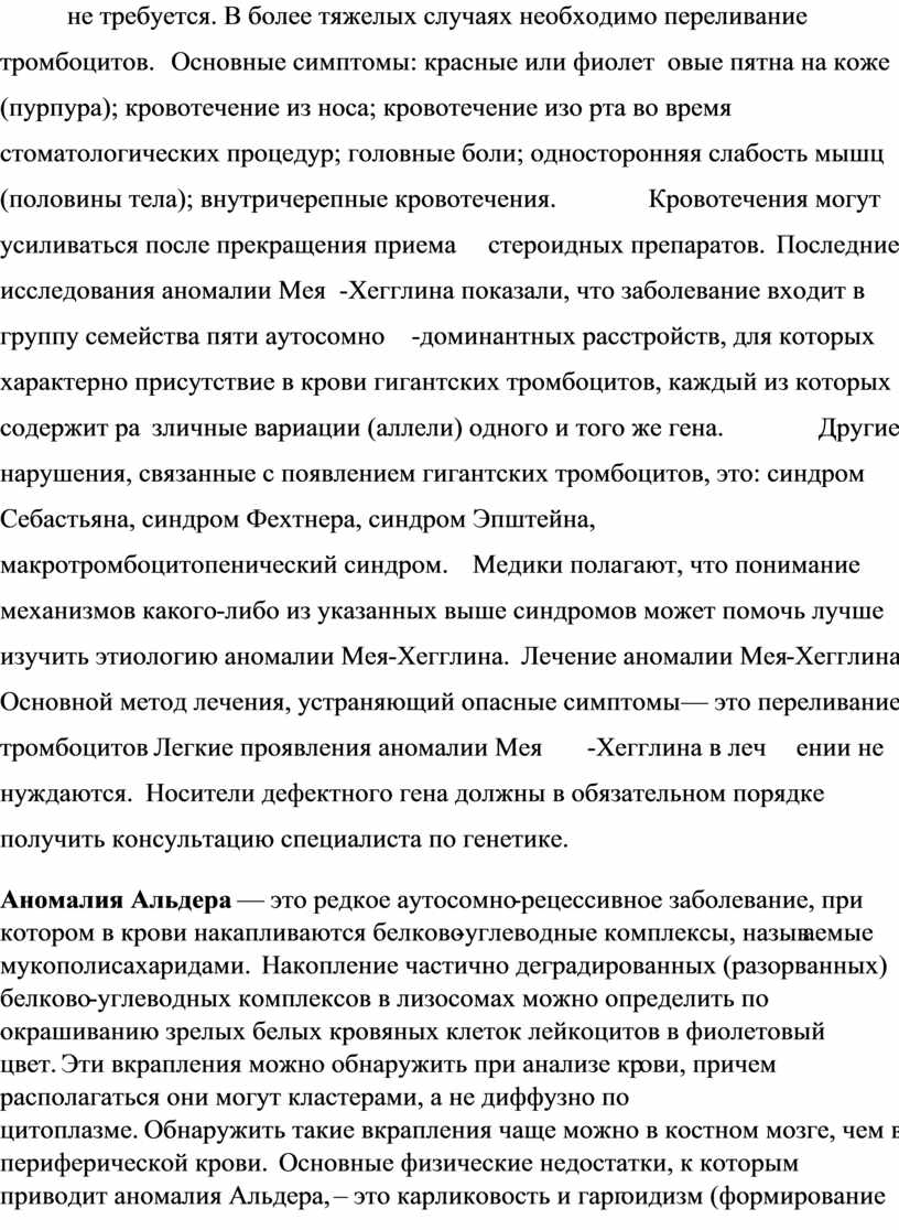 Симптомы аномалии Мея-Хегглина. Проявления аномалии Мея-Хегглина у некоторых больных могут полностью отсутствовать, а у других проявляются в аномальных кровотечениях. В легких случаях лечение аномалии не требуется. В более тяжелых случаях необходимо переливание тромбоцитов. Основные симптомы: красные или фиолетовые пятна на коже (пурпура); кровотечение из носа; кровотечение изо рта во время стоматологических процедур; головные боли; односторонняя слабость мышц (половины тела); внутричерепные кровотечения. Кровотечения могут усиливаться после прекращения приема стероидных препаратов. Последние исследования аномалии Мея-Хегглина показали, что заболевание входит в группу семейства пяти аутосомно-доминантных расстройств, для которых характерно присутствие в крови гигантских тромбоцитов, каждый из которых содержит различные вариации (аллели) одного и того же гена. Другие нарушения, связанные с появлением гигантских тромбоцитов, это: синдром Себастьяна, синдром Фехтнера, синдром Эпштейна, макротромбоцитопенический синдром. Медики полагают, что понимание механизмов какого-либо из указанных выше синдромов может помочь лучше изучить этиологию аномалии Мея-Хегглина. Лечение аномалии Мея-Хегглина Основной метод лечения, устраняющий опасные симптомы — это переливание тромбоцитов Легкие проявления аномалии Мея-Хегглина в лечении не нуждаются. Носители дефектного гена должны в обязательном порядке получить консультацию специалиста по генетике.