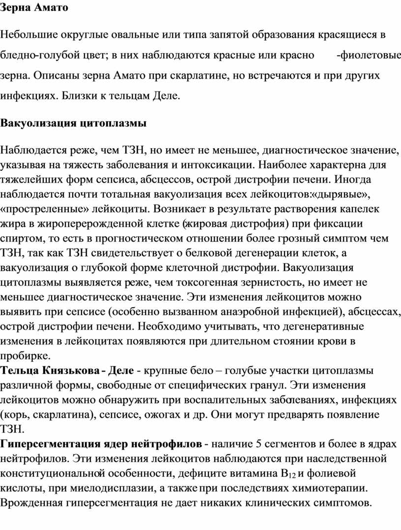 4. Зерна Амато. Выявляются в цитоплазме нейтрофилов в виде небольших, округлых, овальных или похожих на запятую образований бледно-голубого цвета и содержащих красные или красновато-фиолетовые зерна. Встречаются при скарлатине.