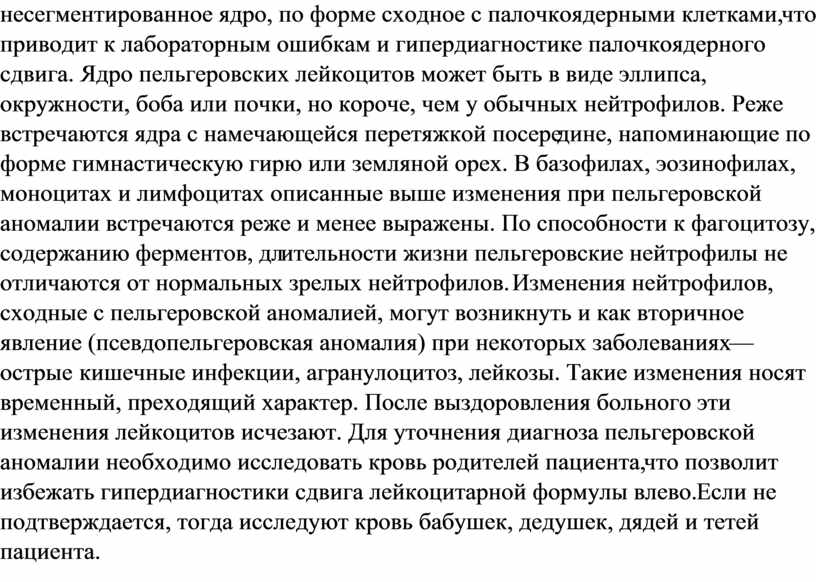 Пельгеровская аномалия - доминантно наследуемое нарушение созревания гранулоцитов, характеризующееся уменьшением сегментации ядер нейтрофилов. Наиболее часто зрелые нейтрофилы содержат двухсегментное или несегментное ядро, редко - трехсегментное. По своим физиологическим свойствам такие клетки не отличаются от нормальных, зрелых нейтрофилов.
