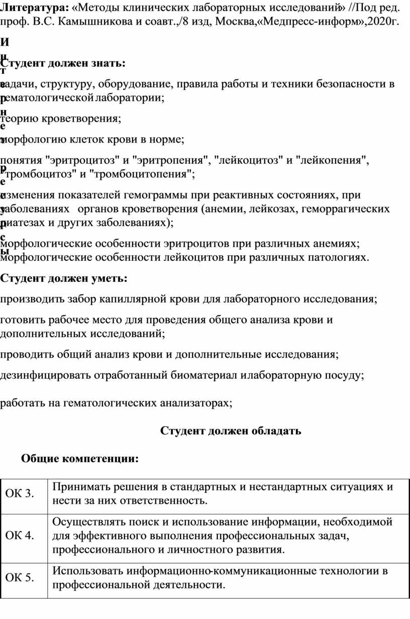 Литература: «Методы клинических лабораторных исследований» //Под ред. проф. В.С. Камышникова и соавт.,/8 изд, Москва, «Медпресс-информ»,2020г.
