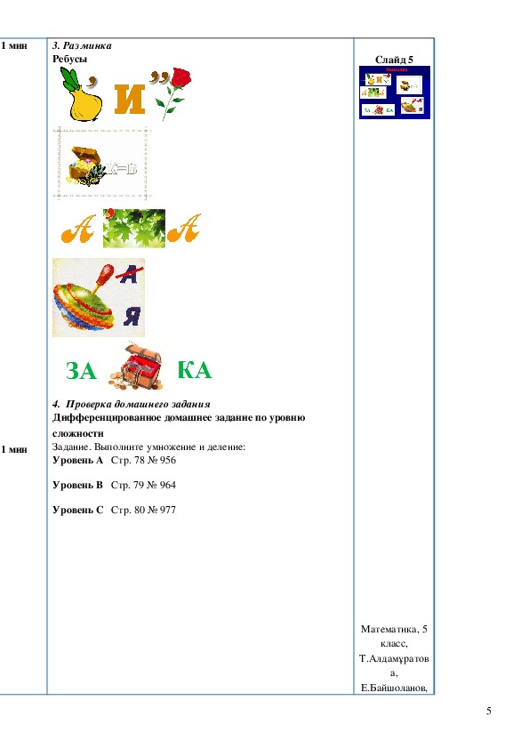 Класс: 5 Количество присутствующих: Количество отсутствующих: