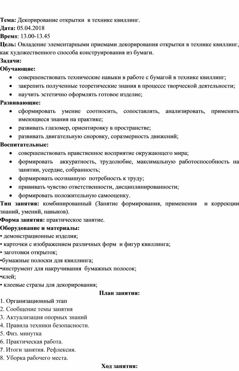 Цель: Овладение элементарными приемами декорирования открытки в технике квиллинг, как художественного способа конструирования из бумаги.