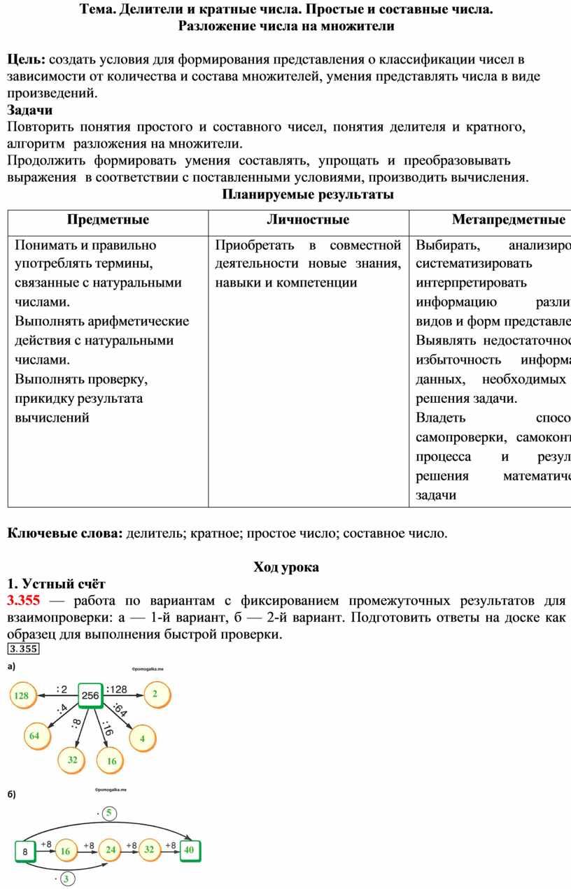 Ключевые слова: делитель; кратное; простое число; составное число.