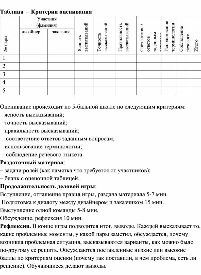 Рефлексия. В конце игры подводится итог, выводы. Каждый высказывает то, какие проблемные моменты, у какой пары заметил, обсуждается, почему возникла проблемная ситуация, высказываются варианты, как можно было по-другому ее решить. Обсуждаются поставленные низкие или высокие баллы по критериям оценки (почему так поставили, в чем проблема, есть ли решение). Обучающиеся делают выводы.