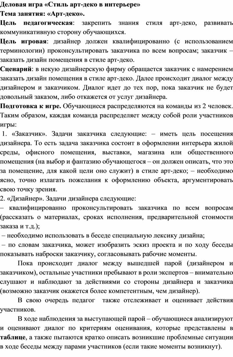 1. «Заказчик». Задачи заказчика следующие: – иметь цель посещения дизайнера. То есть задача заказчика состоит в оформлении интерьера жилой среды, офисного помещения, выставки, магазина или общественного помещения (на выбор и фантазию обучающегося – он должен описать, что это за помещение, для какой цели оно служит) в стиле арт-деко; – необходимо ясно, точно излагать пожелания к оформлению объекта, аргументировать свою точку зрения.