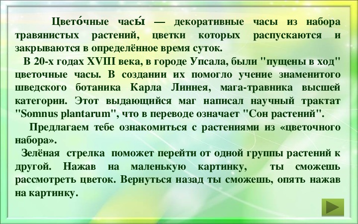 Работа с презентацией осуществляется по управляющим кнопкам. При нажатии на зелёную стрелку происходит смена блоков. При нажатии на маленькую картинку, открывается большое. Для возврата на слайд с лентой необходимо нажать на картинку.Демонстрационный материал "Цветочные часы"