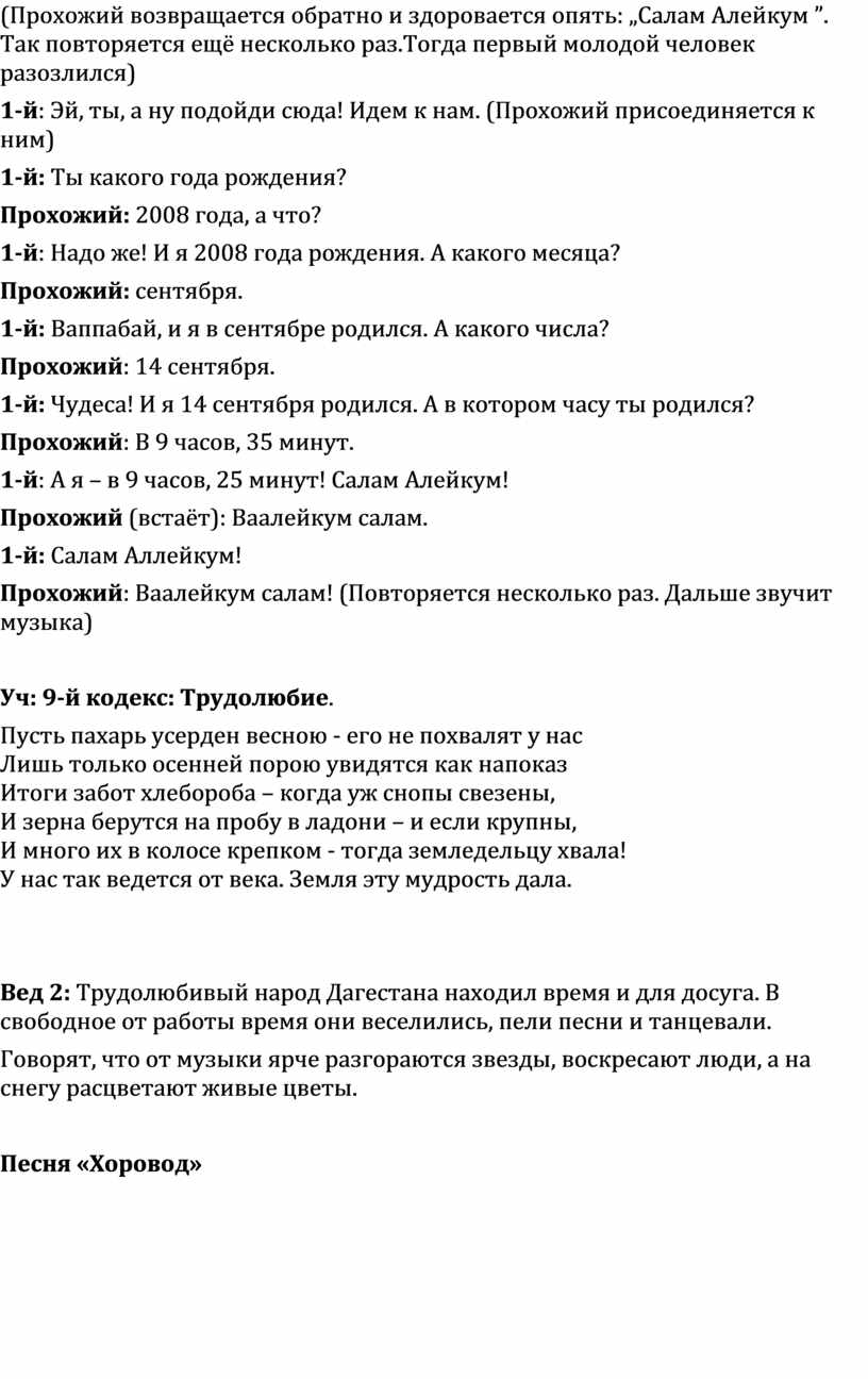 Вед1: Ведь главное для счастья и процветания нашей республики — это неделимость, нерушимость, единство всех народов и наций. Чувство семьи единой — вот что необходимо, чтобы сохранить и развивать особенности каждой нации и всего Дагестана. Основа любого народа — это язык, религия и культура.