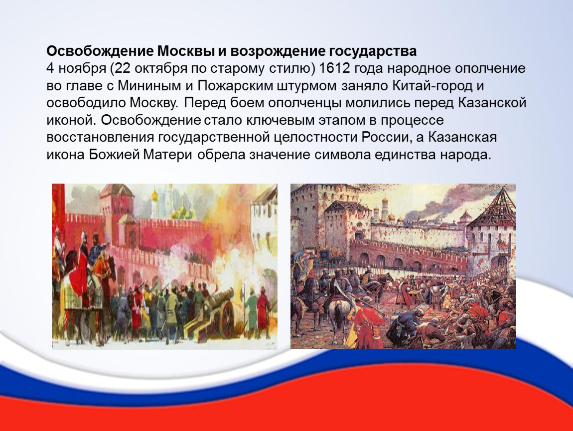 Особую историческую значимость Казанская икона приобрела в 1612 году, когда ее список был передан народному ополчению во главе с Кузьмой Мининым и Дмитрием Пожарским. Эта икона сопровождала войско при освобождении Москвы от польских интервентов. С тех пор образ Казанской Божией Матери ассоциируется с национальным единством и победой над внешней угрозой.