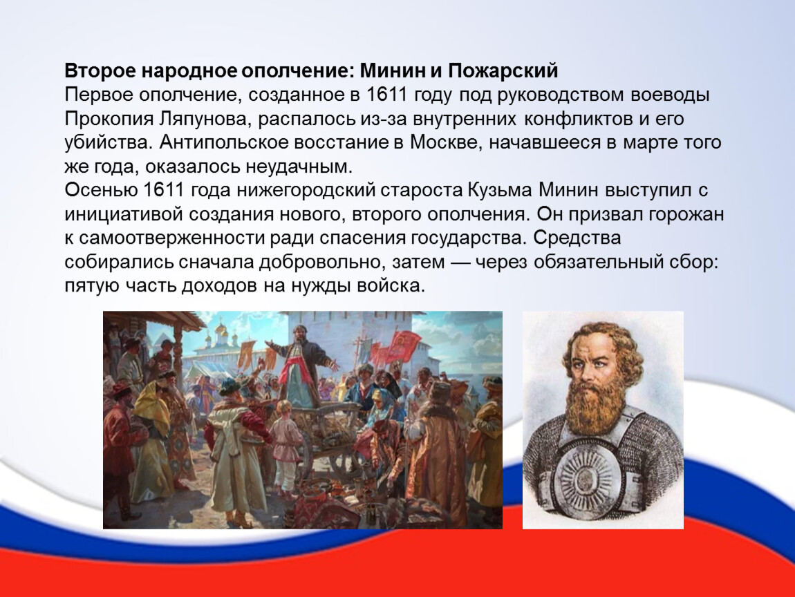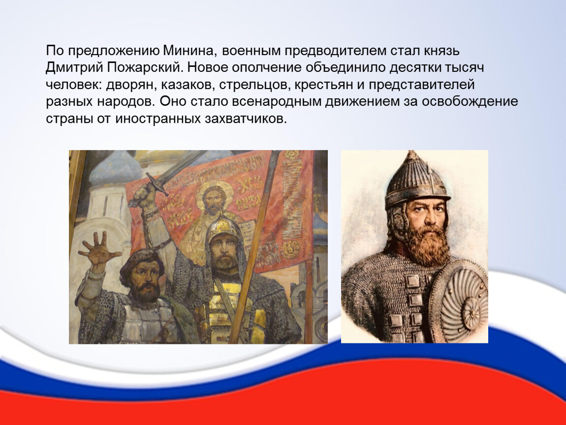 По предложению Минина, военным предводителем стал князь Дмитрий Пожарский. Новое ополчение объединило десятки тысяч человек: дворян, казаков, стрельцов, крестьян и представителей разных народов. Оно стало всенародным движением за освобождение страны от иностранных захватчиков.