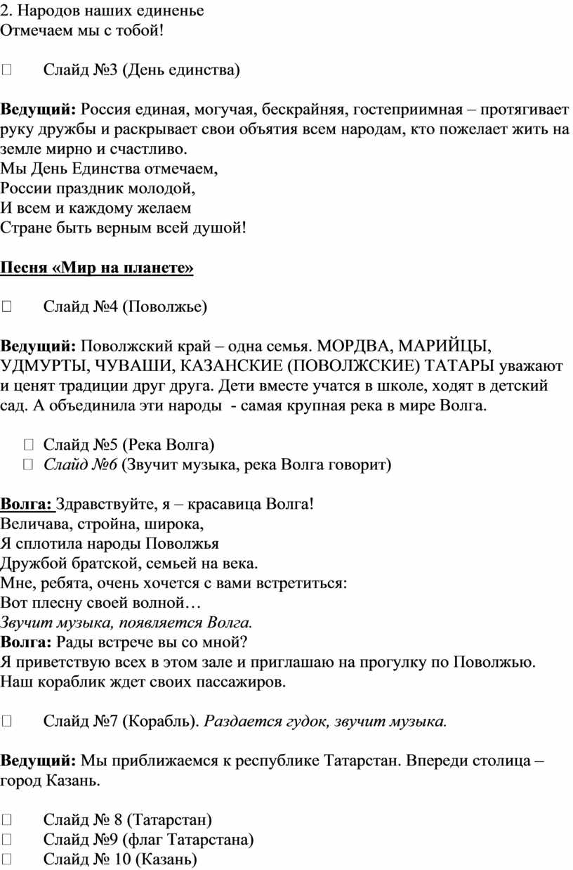 Ведущий: Поволжский край – одна семья. МОРДВА, МАРИЙЦЫ, УДМУРТЫ, ЧУВАШИ, КАЗАНСКИЕ (ПОВОЛЖСКИЕ) ТАТАРЫ уважают и ценят традиции друг друга. Дети вместе учатся в школе, ходят в детский сад. А объединила эти народы - самая крупная река в мире Волга.