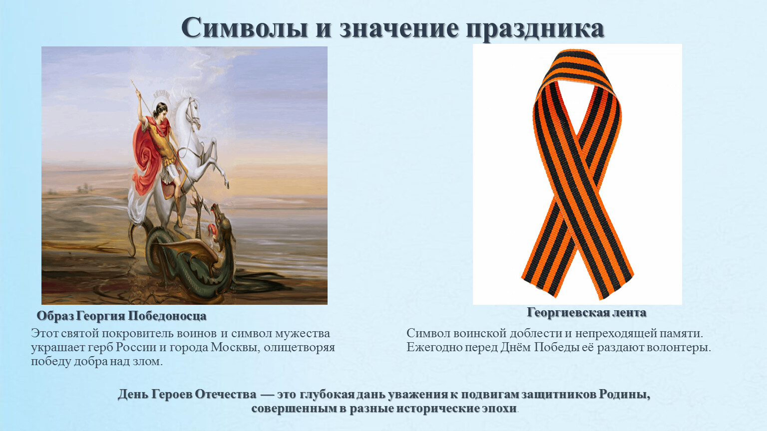 В этот день мы чтим подвиги Героев Советского Союза, Героев Российской Федерации, а также кавалеров орденов Святого Георгия и Славы, проявивших беспримерное мужество.