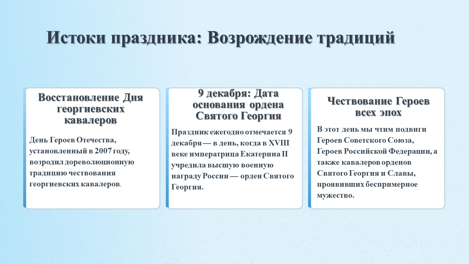 День Героев Отечества, установленный в 2007 году, возродил дореволюционную традицию чествования георгиевских кавалеров.