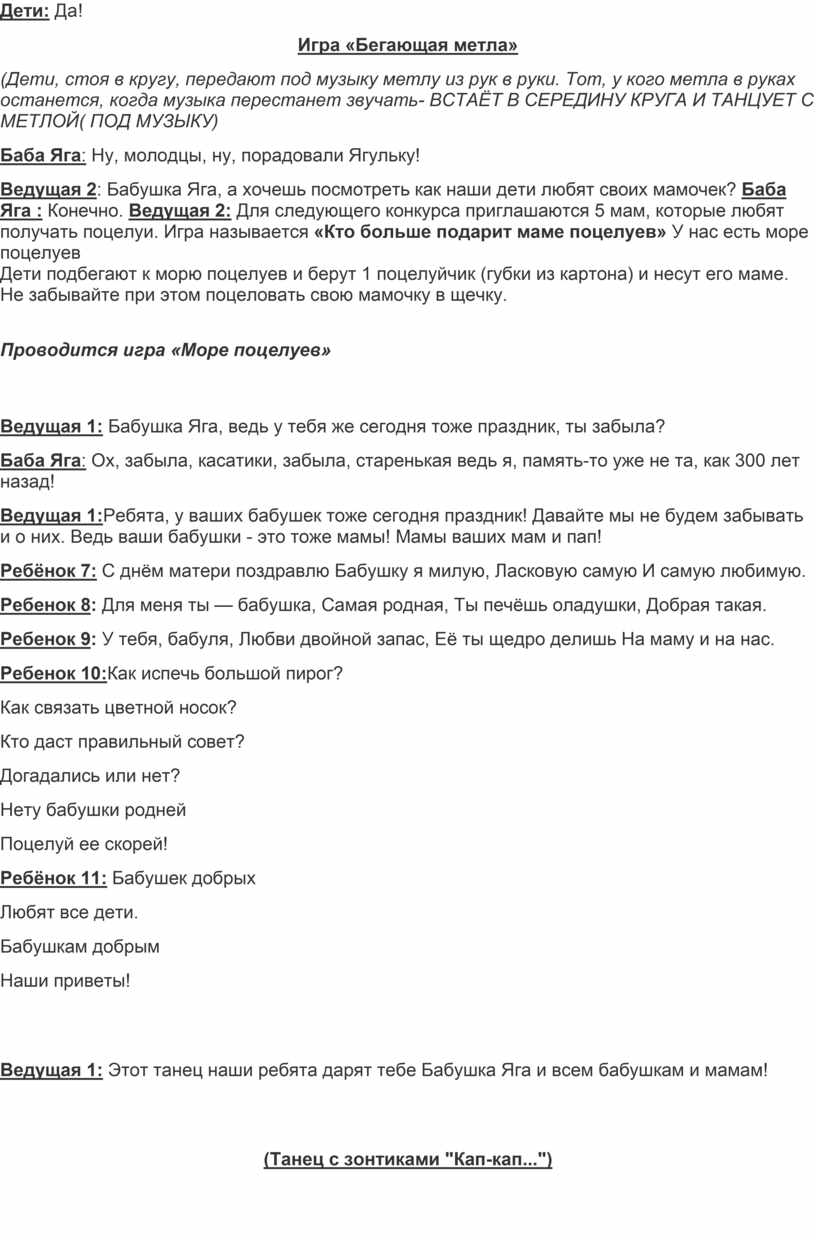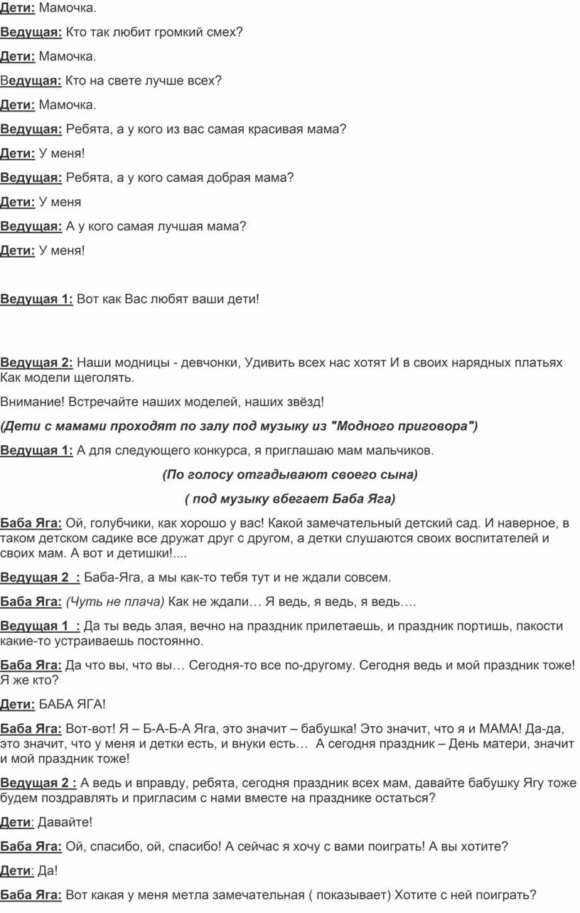 Баба Яга: Вот-вот! Я – Б-А-Б-А Яга, это значит – бабушка! Это значит, что я и МАМА! Да-да, это значит, что у меня и детки есть, и внуки есть… А сегодня праздник – День матери, значит и мой праздник тоже!