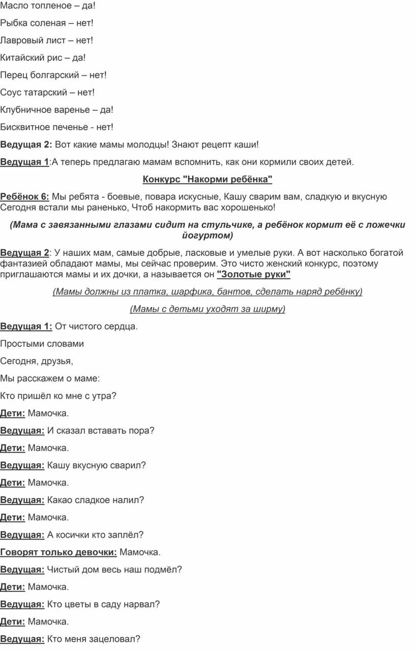 Ведущая 2: А вот мы сейчас и проверим, все ли мамы готовить умеют? Прежде, чем допускать их к продуктам))