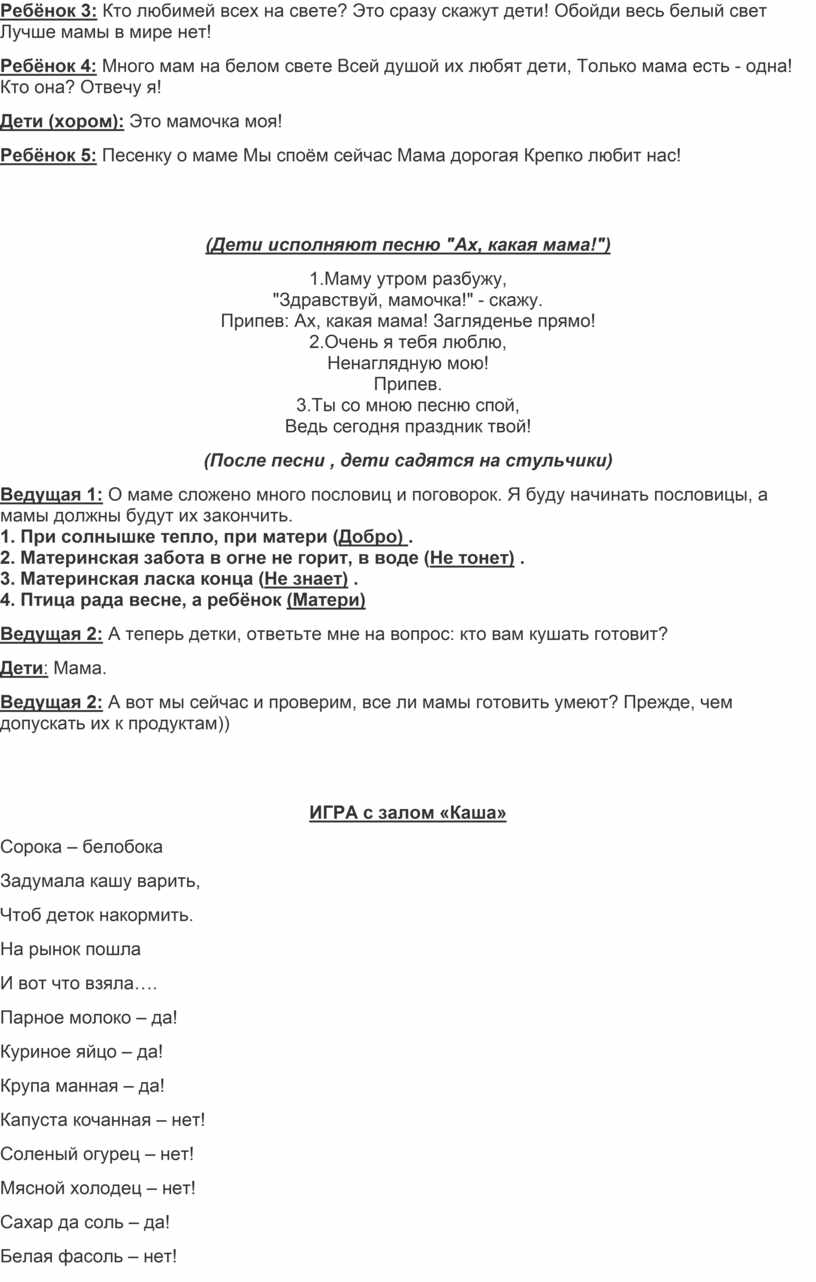 Ведущая 2: А теперь детки, ответьте мне на вопрос: кто вам кушать готовит?