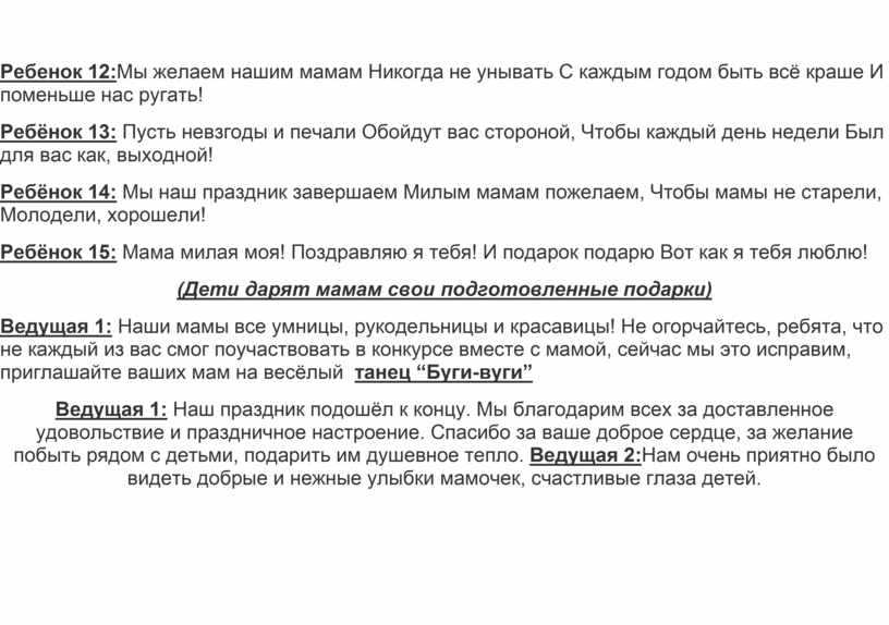 Ведущая 1: Наш праздник подошёл к концу. Мы благодарим всех за доставленное удовольствие и праздничное настроение. Спасибо за ваше доброе сердце, за желание побыть рядом с детьми, подарить им душевное тепло. Ведущая 2:Нам очень приятно было видеть добрые и нежные улыбки мамочек, счастливые глаза детей.