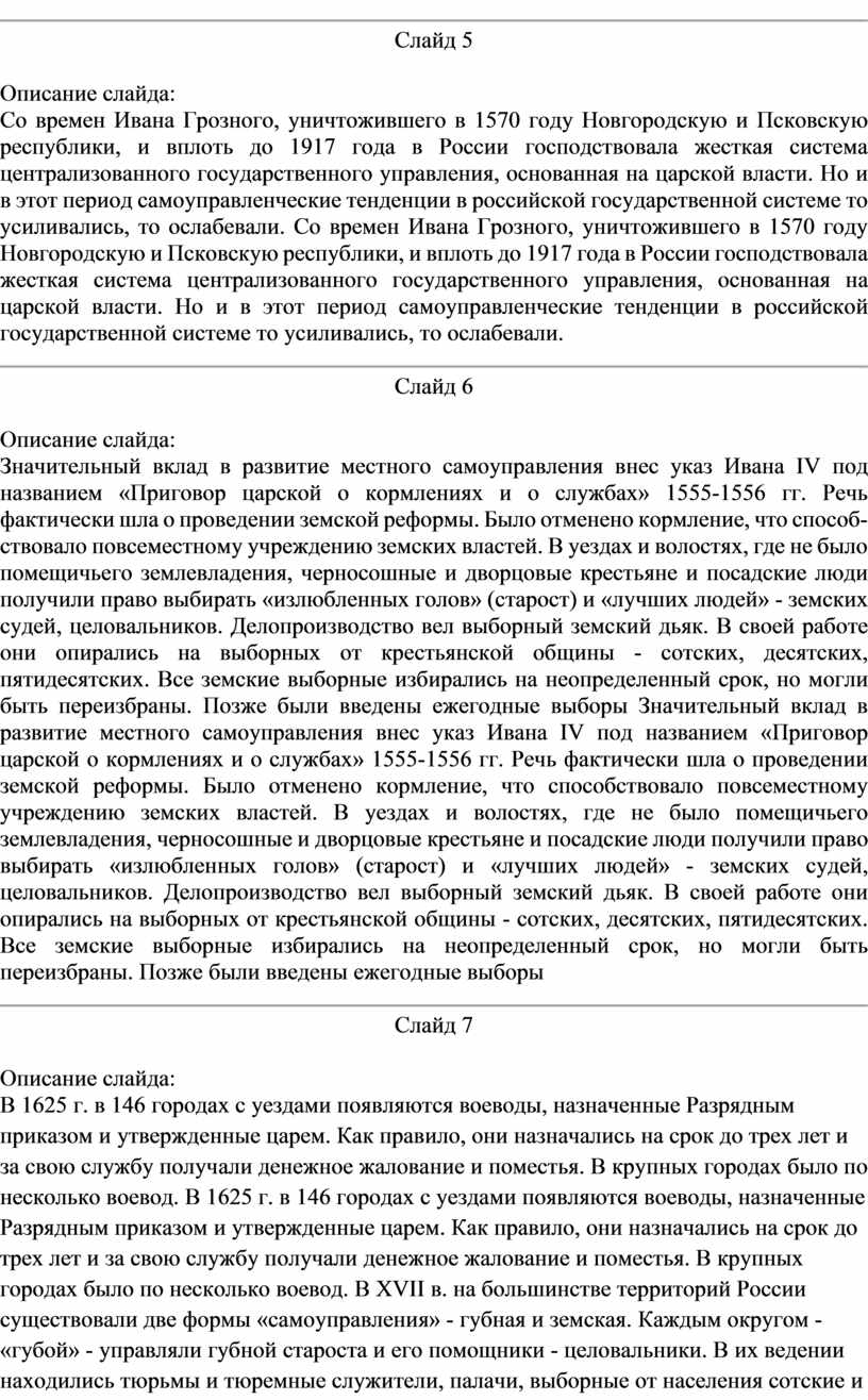 Значительный вклад в развитие местного самоуправления внес указ Ивана IV под названием «Приговор царской о кормлениях и о службах» 1555-1556 гг. Речь фактически шла о проведении земской реформы. Было отменено кормление, что способствовало повсеместному учреждению земских властей. В уездах и волостях, где не было помещичьего землевладения, черносошные и дворцовые крестьяне и посадские люди получили право выбирать «излюбленных голов» (старост) и «лучших людей» - земских судей, целовальников. Делопроизводство вел выборный земский дьяк. В своей работе они опирались на выборных от крестьянской общины - сотских, десятских, пятидесятских. Все земские выборные избирались на неопределенный срок, но могли быть переизбраны. Позже были введены ежегодные выборы Значительный вклад в развитие местного самоуправления внес указ Ивана IV под названием «Приговор царской о кормлениях и о службах» 1555-1556 гг. Речь фактически шла о проведении земской реформы. Было отменено кормление, что способствовало повсеместному учреждению земских властей. В уездах и волостях, где не было помещичьего землевладения, черносошные и дворцовые крестьяне и посадские люди получили право выбирать «излюбленных голов» (старост) и «лучших людей» - земских судей, целовальников. Делопроизводство вел выборный земский дьяк. В своей работе они опирались на выборных от крестьянской общины - сотских, десятских, пятидесятских. Все земские выборные избирались на неопределенный срок, но могли быть переизбраны. Позже были введены ежегодные выборы