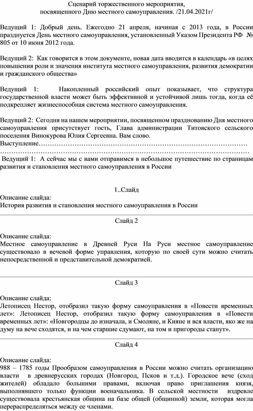 Сценарий торжественного мероприятия, посвященного Дню местного самоуправления. /21.04.2021г/