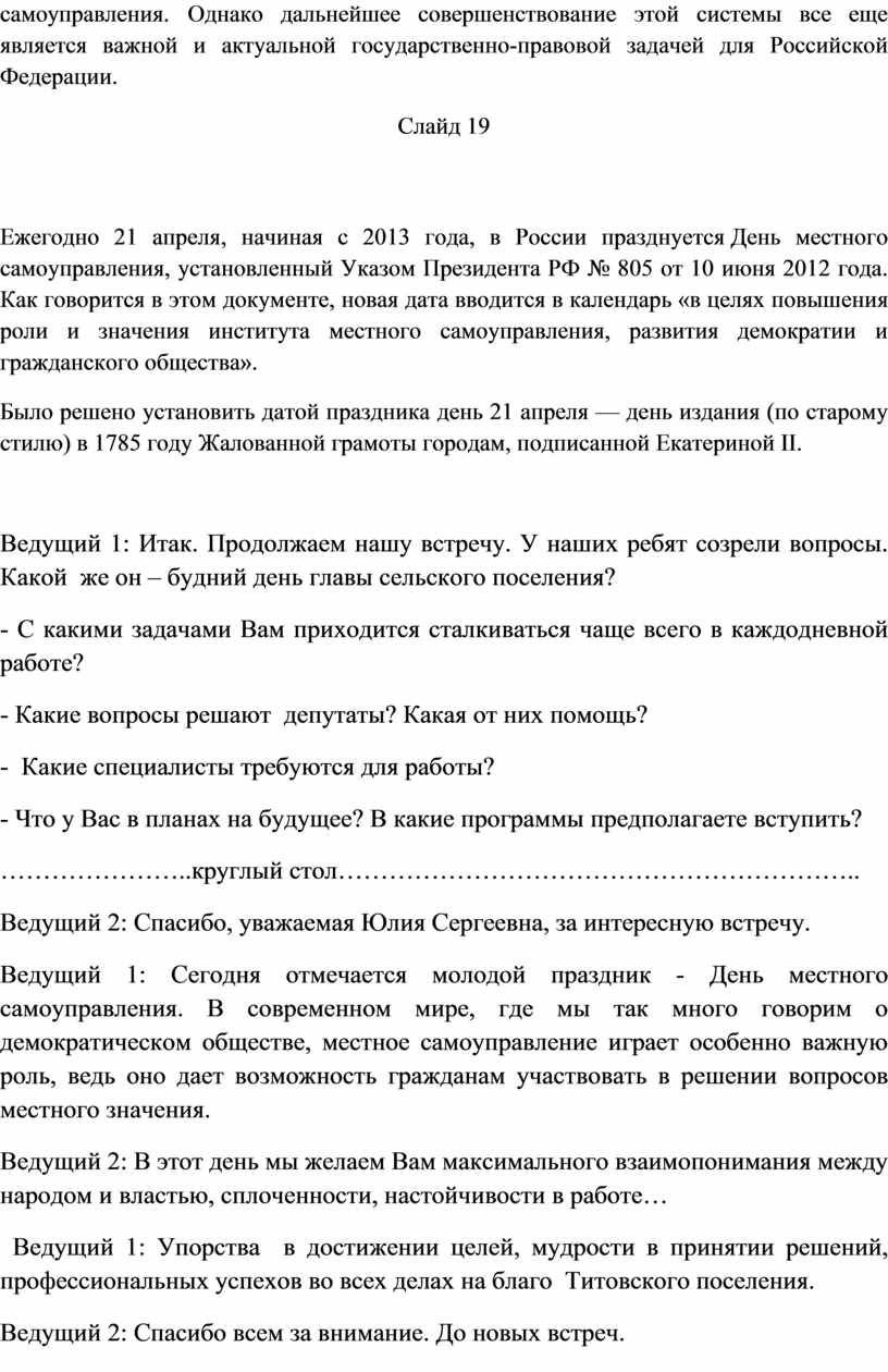 Ведущий 1: Добрый день. Ежегодно 21 апреля, начиная с 2013 года, в России празднуется День местного самоуправления, установленный Указом Президента РФ № 805 от 10 июня 2012 года.