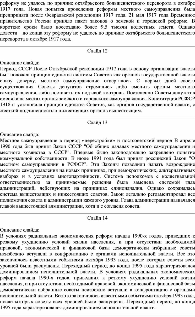 Период СССР После Октябрьской революции 1917 года в основу организации власти был положен принцип единства системы Советов как органов государственной власти снизу доверху, местное самоуправление отвергалось. С первых дней своего существования Советы депутатов стремились либо сменить органы местного самоуправления, либо поставить их под свой контроль. Постепенно Советы депутатов сменяли на местах органы земского и городского самоуправления. Конституция РСФСР 1918 г. установила принцип единства Советов, как органов государственной власти, с жесткой подчиненностью нижестоящих органов вышестоящим.