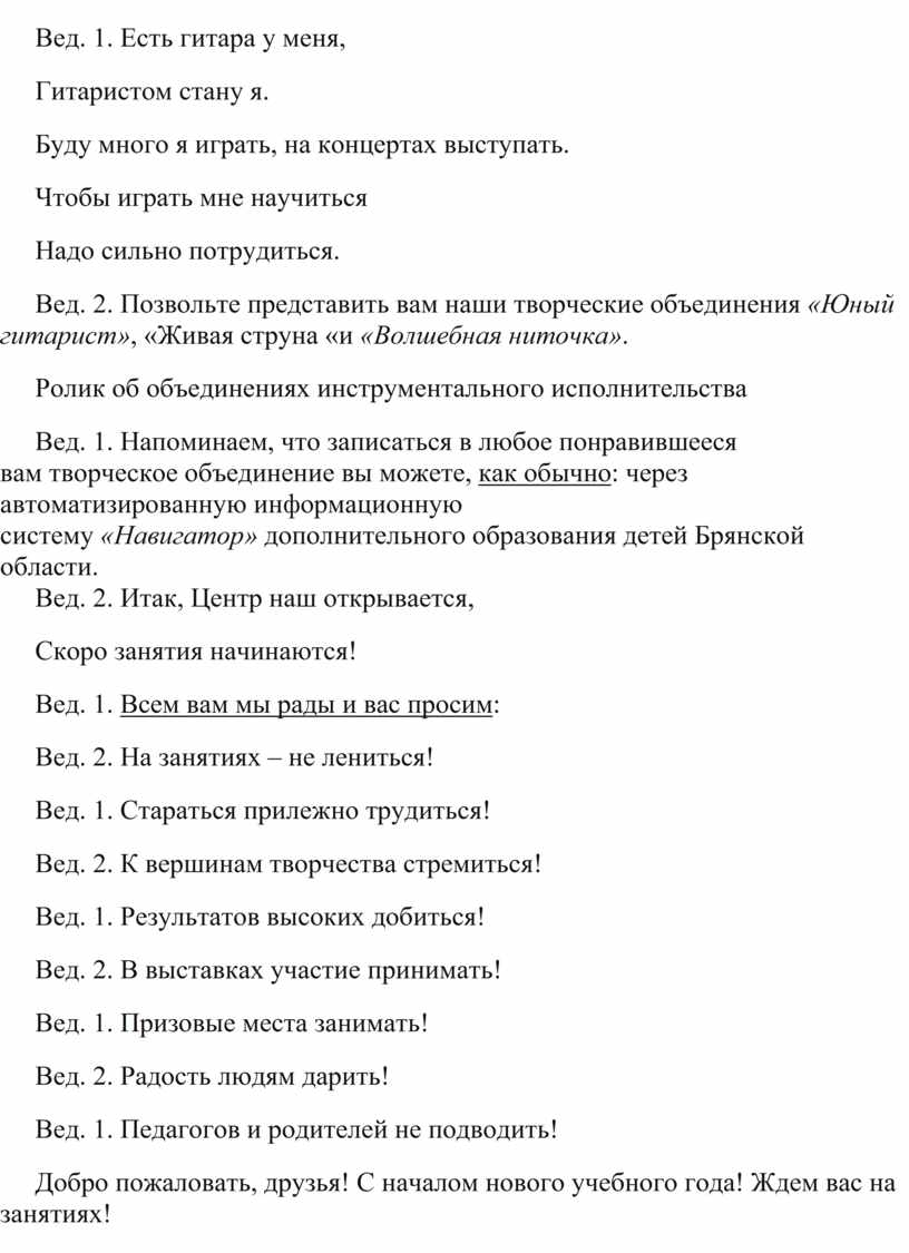 Вед. 1. Напоминаем, что записаться в любое понравившееся вам творческое объединение вы можете, как обычно: через автоматизированную информационную систему «Навигатор» дополнительного образования детей Брянской области.