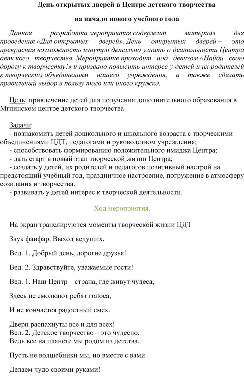 Данная разработка мероприятия содержит материал для проведения «Дня открытых дверей». День открытых дверей – это прекрасная возможность изнутри детально узнать о деятельности Центра детского творчества. Мероприятие проходит под девизом «Найди свою дорогу к творчеству!» и призвано повысить интерес у детей и их родителей к творческим объединениям нашего учреждения, а также сделать правильный выбор в пользу того или иного кружка.