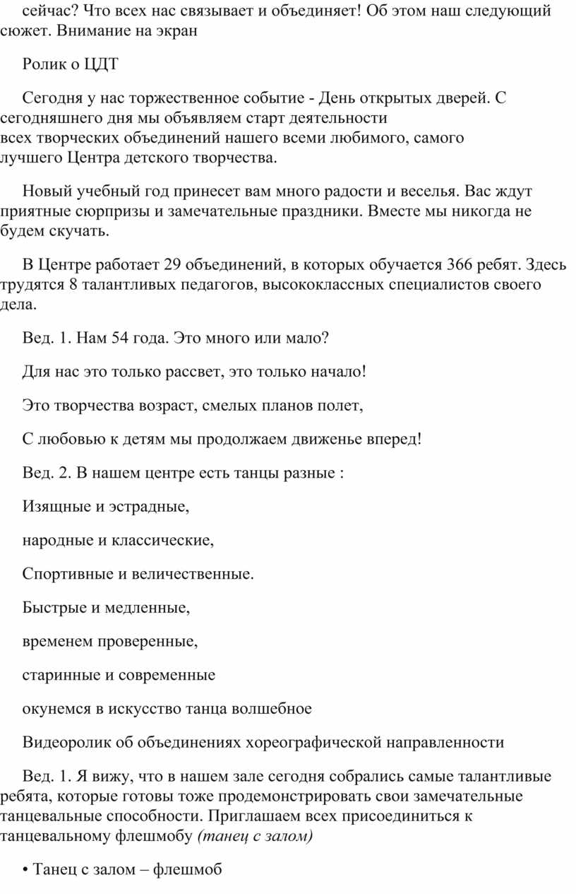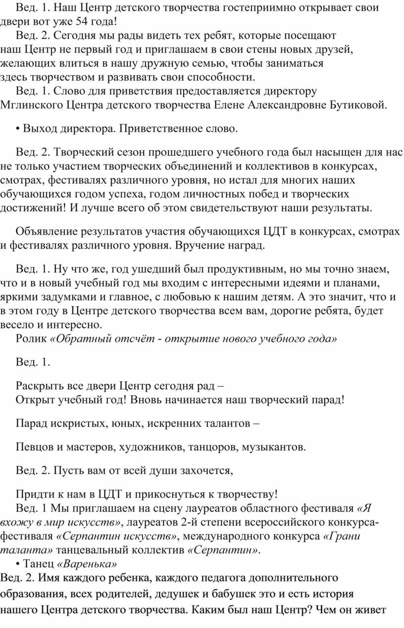 Вед. 1. Наш Центр детского творчества гостеприимно открывает свои двери вот уже 54 года!