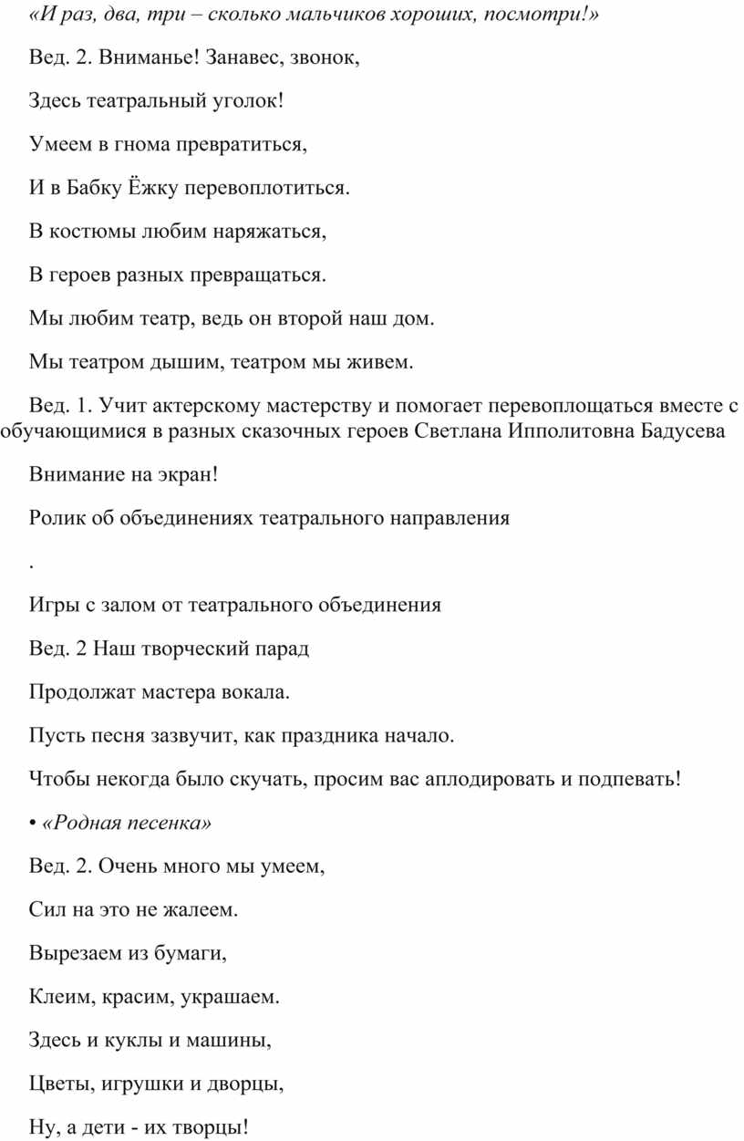 Вед. 2. Сегодня мы рады видеть тех ребят, которые посещают наш Центр не первый год и приглашаем в свои стены новых друзей, желающих влиться в нашу дружную семью, чтобы заниматься здесь творчеством и развивать свои способности.