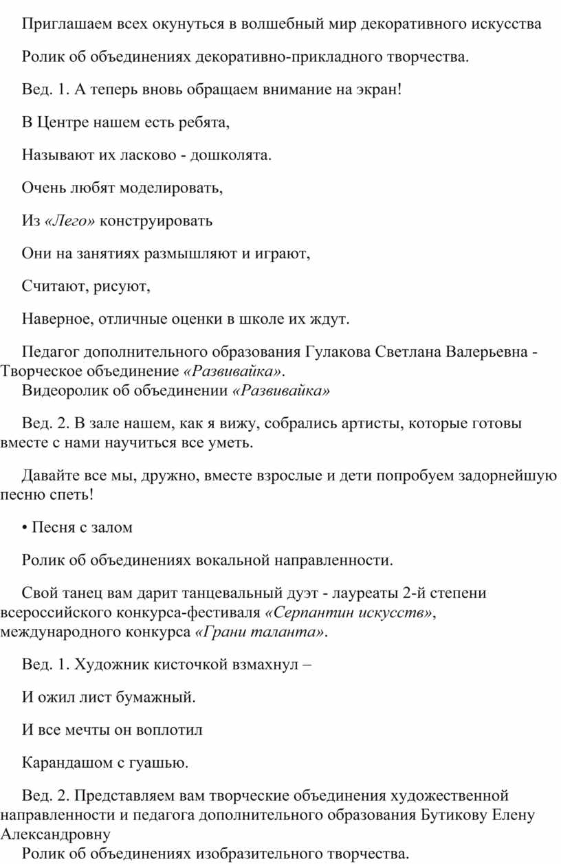 Вед. 2. Представляем вам творческие объединения художественной направленности и педагога дополнительного образования Бутикову Елену Александровну