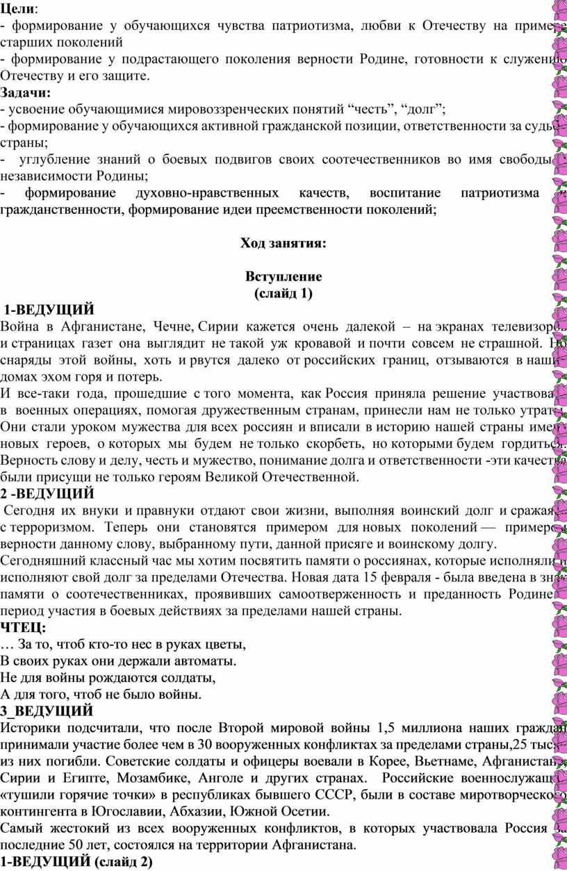 Сегодняшний классный час мы хотим посвятить памяти о россиянах, которые исполняли и исполняют свой долг за пределами Отечества. Новая дата 15 февраля - была введена в знак памяти о соотечественниках, проявивших самоотверженность и преданность Родине в период участия в боевых действиях за пределами нашей страны.