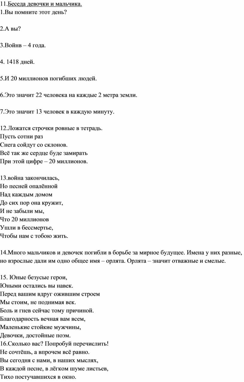 14.Много мальчиков и девочек погибли в борьбе за мирное будущее. Имена у них разные, но взрослые дали им одно общее имя – орлята. Орлята – значит отважные и смелые.