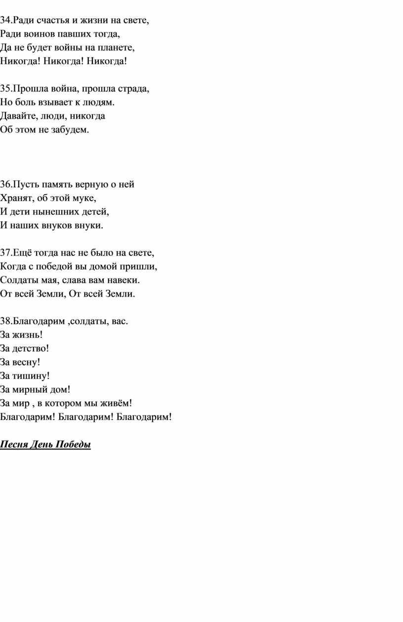 День Победы отмечают во всём мире в знак признательности к нашему народу за великий подвиг. Сегодня мы поздравляем всех с этим великим праздником и желаем всем, чтобы никогда в нашем мире не было войны, чтобы всегда над нашей головой было мирное, голубое небо, чтобы никто и никогда не слышал разрывов бомб, чтобы все народы жили в мире и согласии.