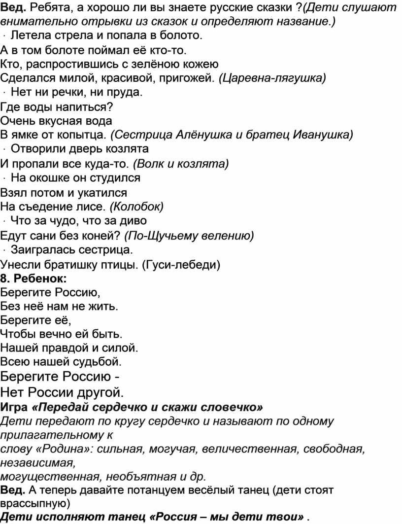 Вед. А что такое Родина? Ребята, кто-нибудь знает, что такое Родина? Здорово!