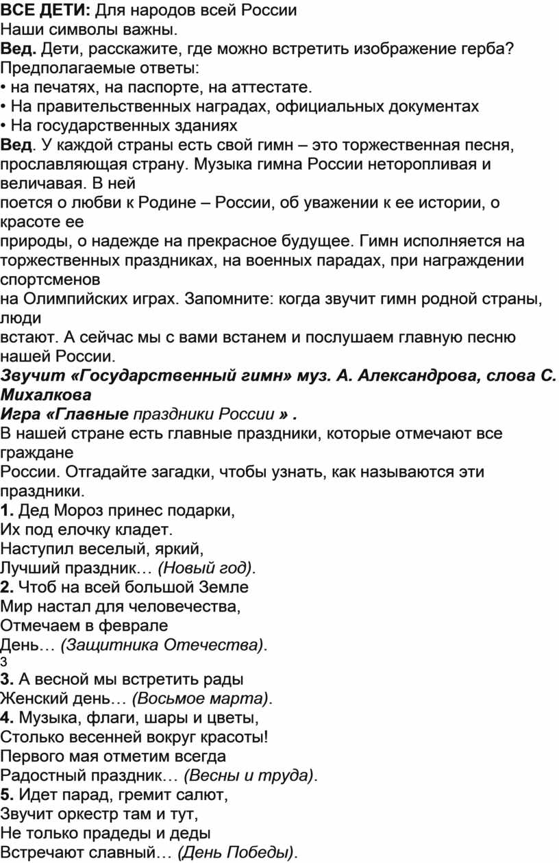 Вед. Как и все страны в мире Россия имеет свой флаг, герб и гимн – это и есть