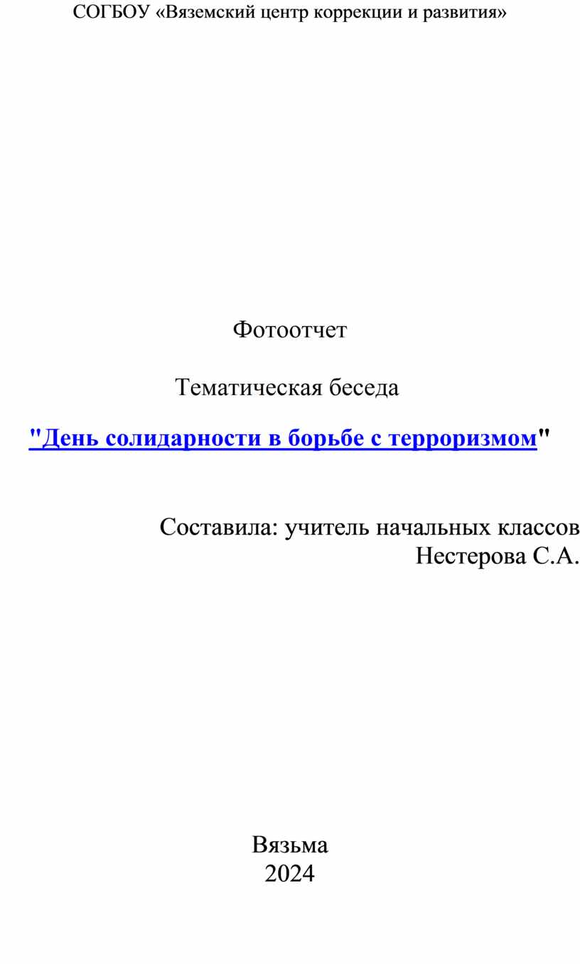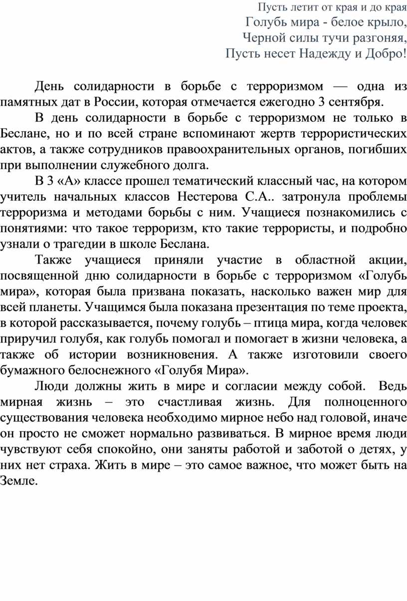 В 3 «А» классе прошел тематический классный час, на котором учитель начальных классов Нестерова С.А.. затронула проблемы терроризма и методами борьбы с ним. Учащиеся познакомились с понятиями: что такое терроризм, кто такие террористы, и подробно узнали о трагедии в школе Беслана.