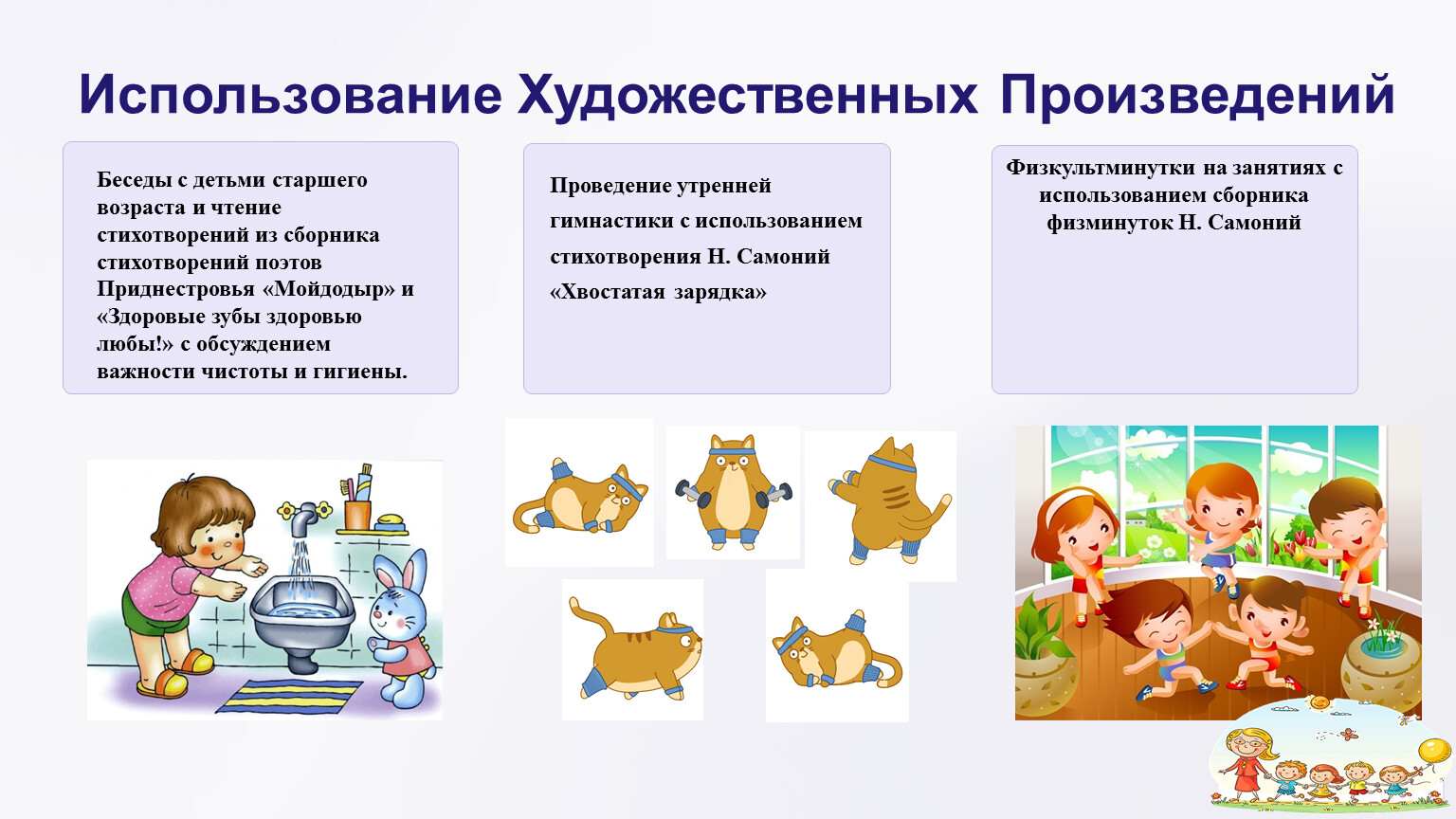 Беседы с детьми старшего возраста и чтение стихотворений из сборника стихотворений поэтов Приднестровья «Мойдодыр» и «Здоровые зубы здоровью любы!» с обсуждением важности чистоты и гигиены.