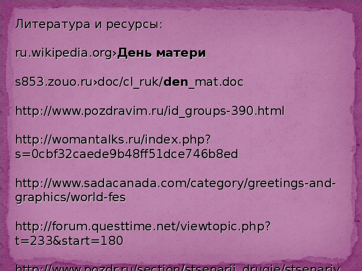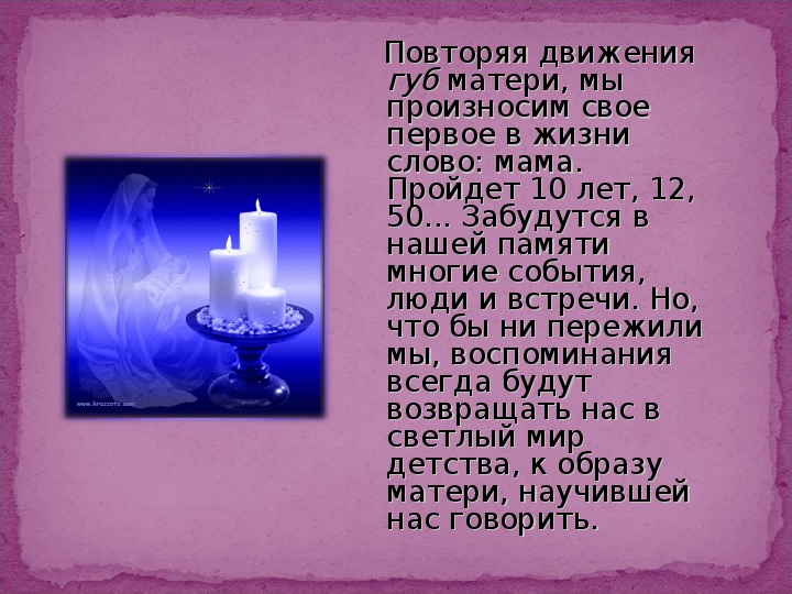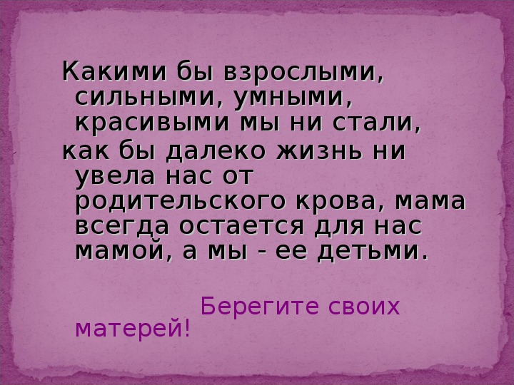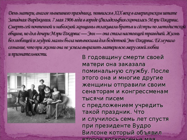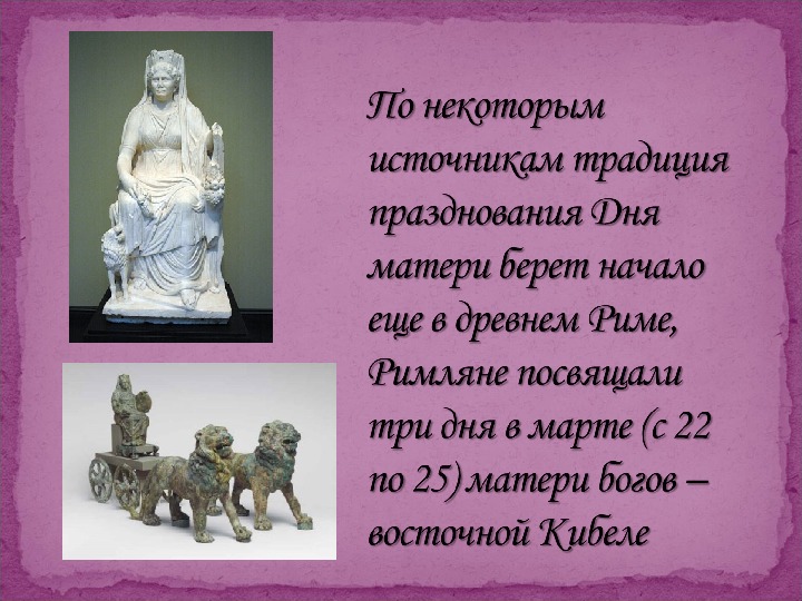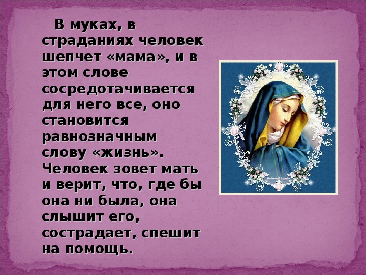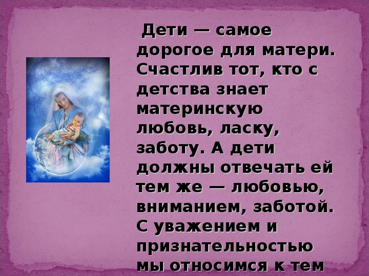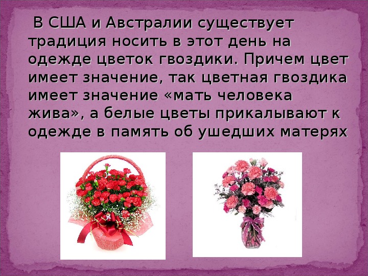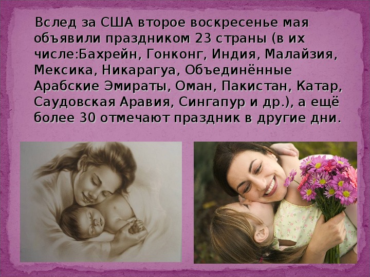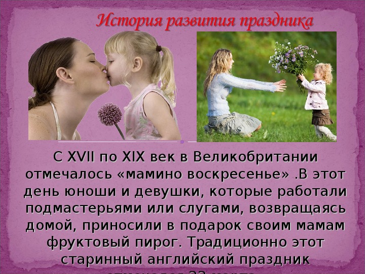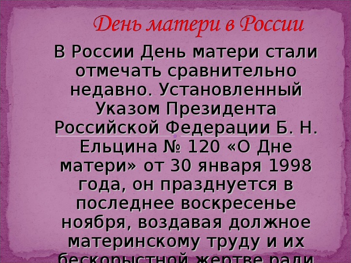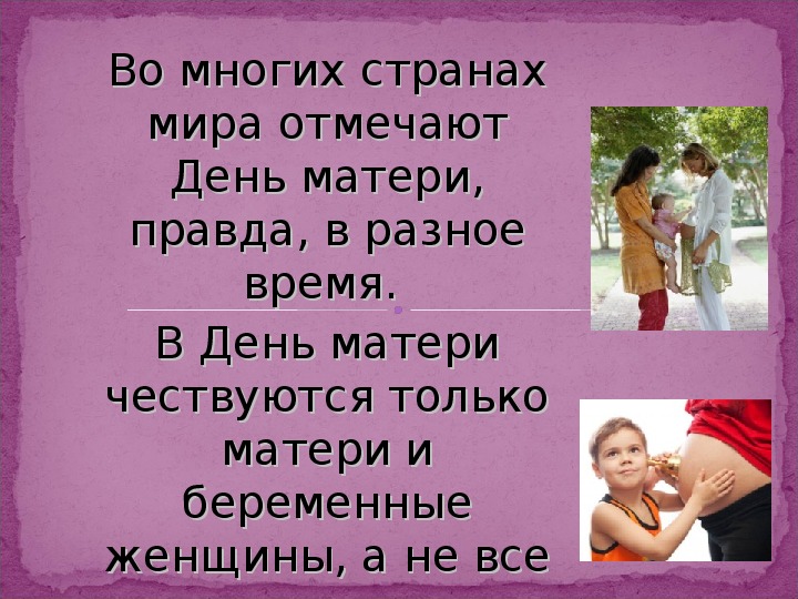 В презентациеи собран материал о создании праздника, когда и где он появился впервые. Презентацию сопровождают красивые картинки,стихи. Рассказывается кого чевствуют в этот день. Во многих странах мира отмечают День матери, правда, в разное время. В День матери чествуются только матери и беременные женщины, а не все представительницы слабого пола.День матери 4 класс