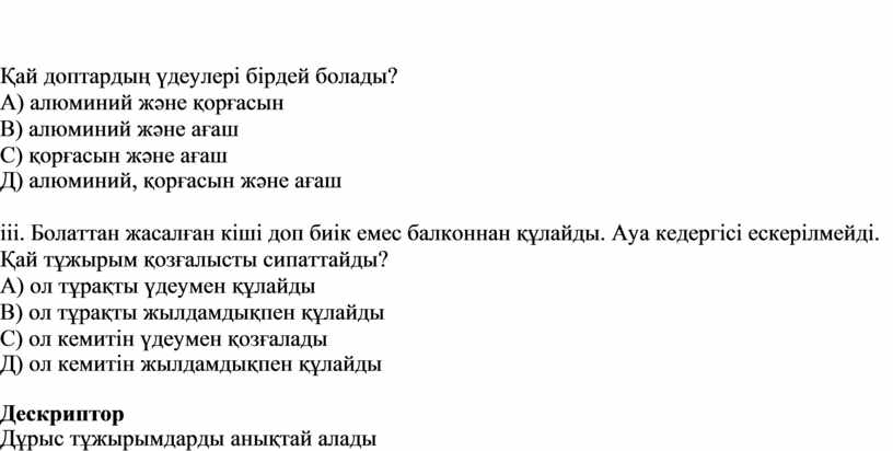 iii. Болаттан жасалған кіші доп биік емес балконнан құлайды. Ауа кедергісі ескерілмейді. Қай тұжырым қозғалысты сипаттайды?