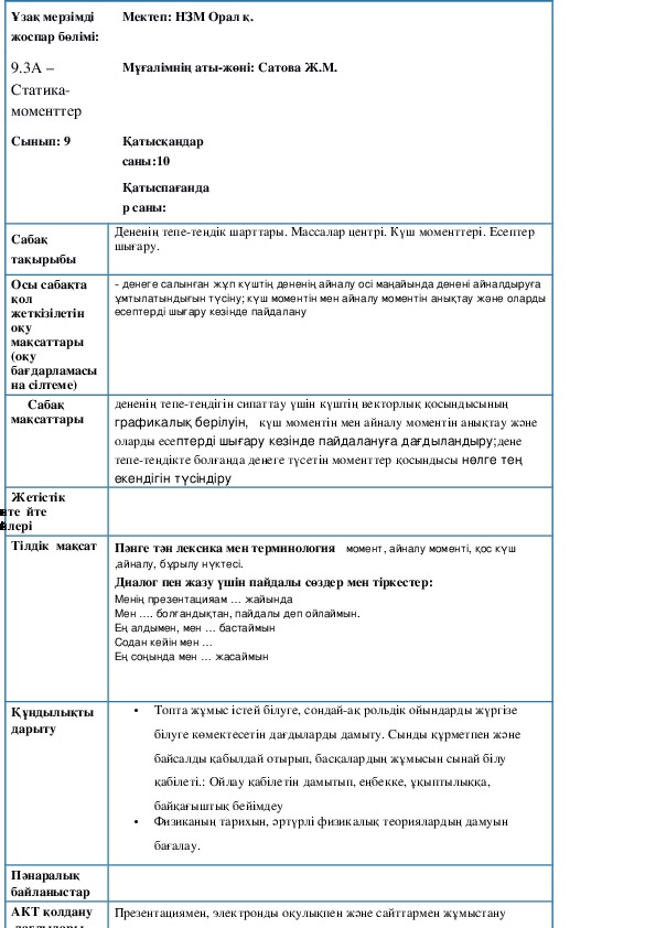 Дененің тепе теңдік шарты тақырыбына сабақ жоспары берілген. Бұл жоспарда сабақ мақсаты мен тілдік мақсаттар , диалогқа қолданатын фразалар келтірілген. Сабақта ұйымдастырылатын топтық, жеке жұмыстың түрлері көрсетілген. Есептер деңгейлік қабілеттеріне байланысты іріктелген. Дерек көздердегі материалдар арқылы оқушылардың танымдық, логикалық қабілетін шыңдауға болады.Дененің тепе-теңдік шарты