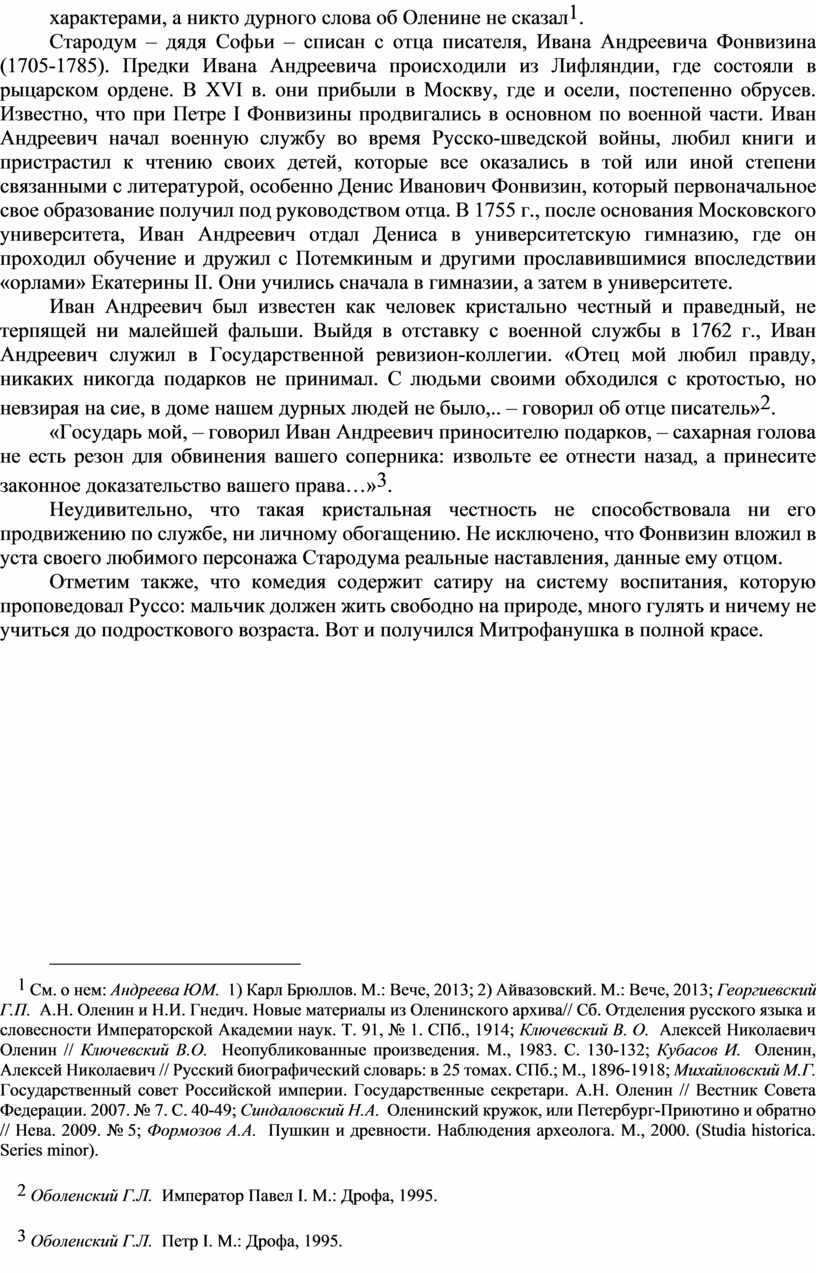Стародум – дядя Софьи – списан с отца писателя, Ивана Андреевича Фонвизина (1705-1785). Предки Ивана Андреевича происходили из Лифляндии, где состояли в рыцарском ордене. В XVI в. они прибыли в Москву, где и осели, постепенно обрусев. Известно, что при Петре I Фонвизины продвигались в основном по военной части. Иван Андреевич начал военную службу во время Русско-шведской войны, любил книги и пристрастил к чтению своих детей, которые все оказались в той или иной степени связанными с литературой, особенно Денис Иванович Фонвизин, который первоначальное свое образование получил под руководством отца. В 1755 г., после основания Московского университета, Иван Андреевич отдал Дениса в университетскую гимназию, где он проходил обучение и дружил с Потемкиным и другими прославившимися впоследствии «орлами» Екатерины II. Они учились сначала в гимназии, а затем в университете.