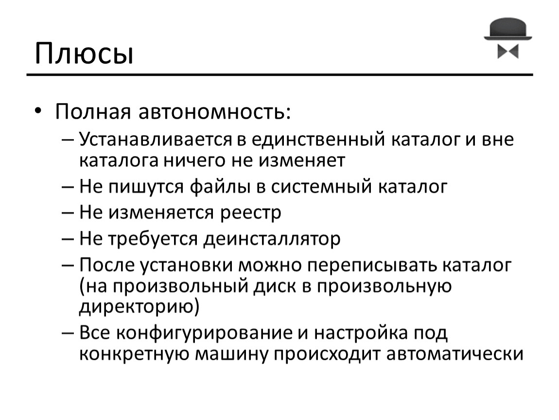 Устанавливается в единственный каталог и вне каталога ничего не изменяет
