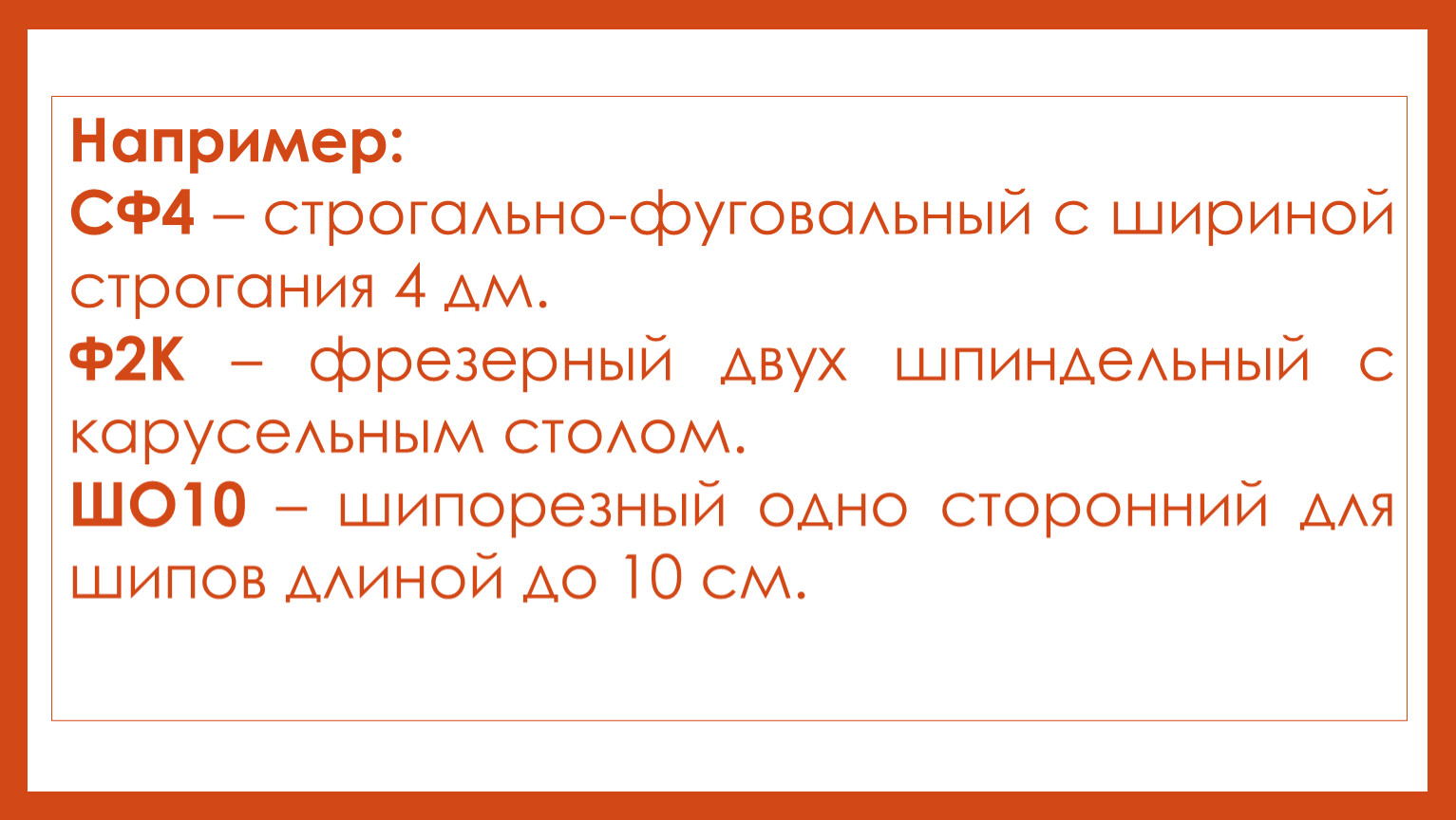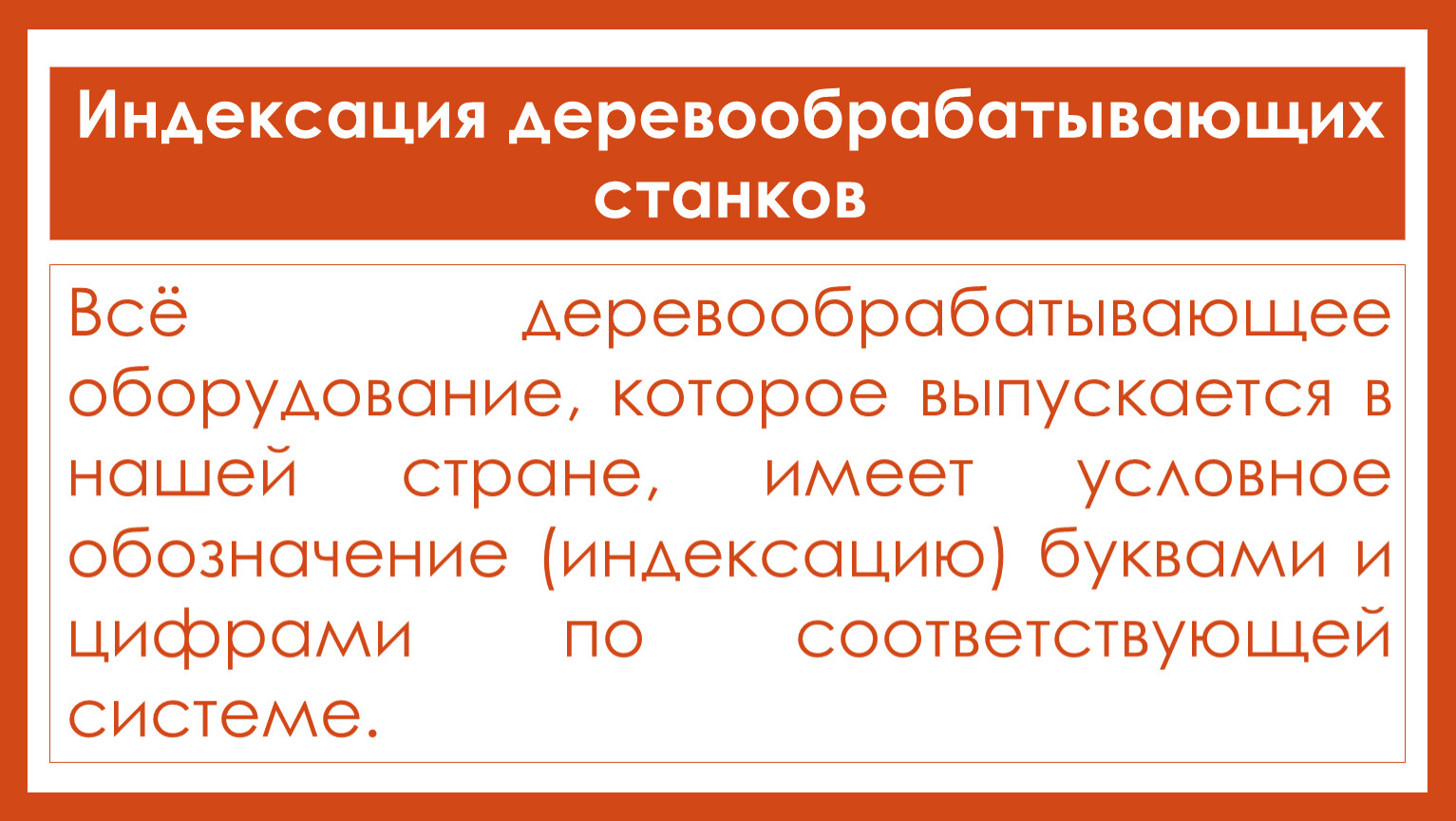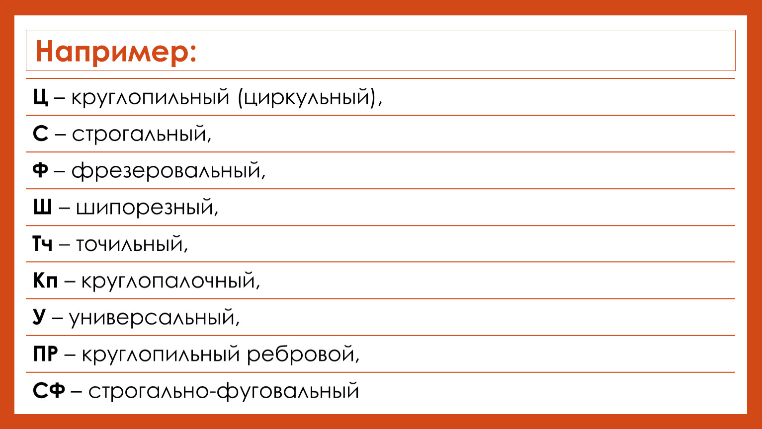 Всё деревообрабатывающее оборудование, которое выпускается в нашей стране, имеет условное обозначение (индексацию) буквами и цифрами по соответствующей системе.