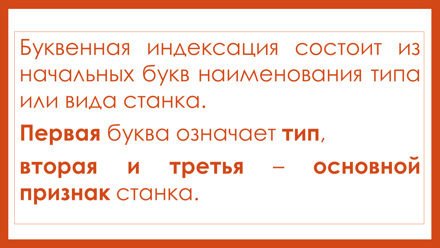 Буквенная индексация состоит из начальных букв наименования типа или вида станка.