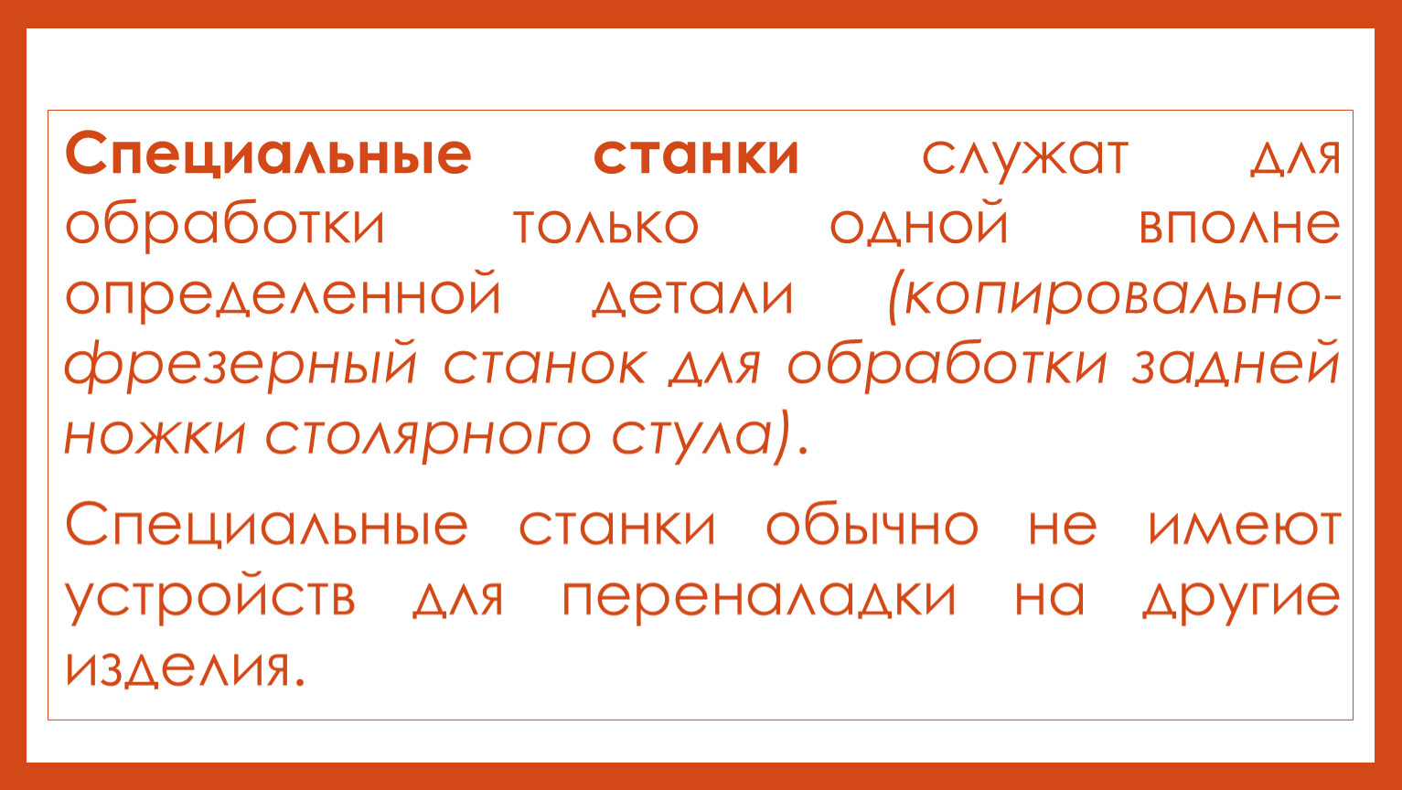 Специальные станки служат для обработки только одной вполне определенной детали (копировально-фрезерный станок для обработки задней ножки столярного стула).