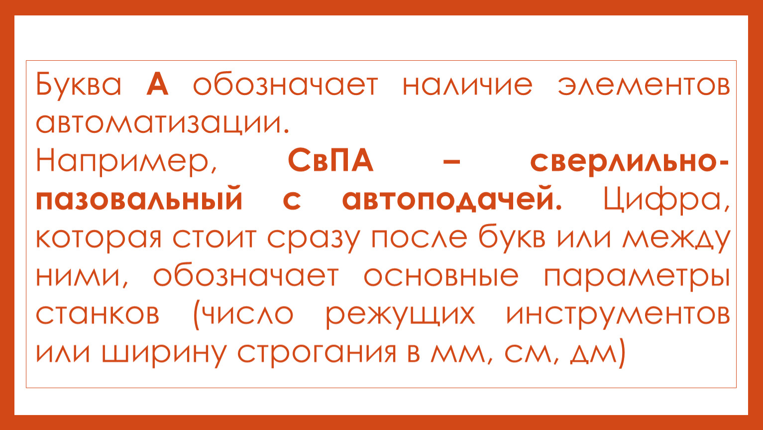 Например, СвПА – сверлильно-пазовальный с автоподачей. Цифра, которая стоит сразу после букв или между ними, обозначает основные параметры станков (число режущих инструментов или ширину строгания в мм, см, дм)