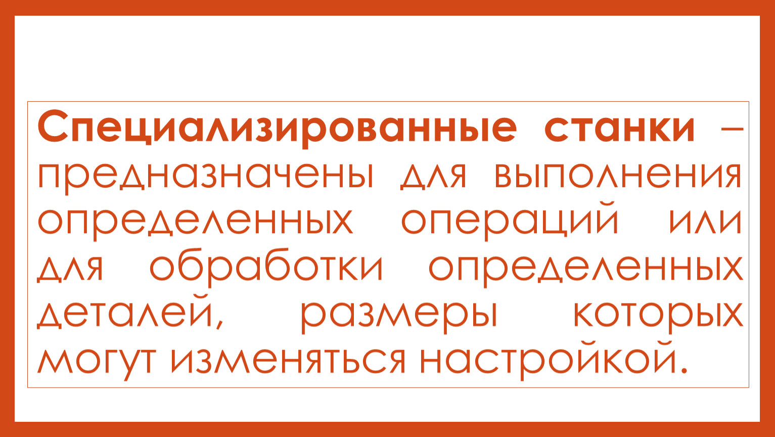 Специализированные станки – предназначены для выполнения определенных операций или для обработки определенных деталей, размеры которых могут изменяться настройкой.