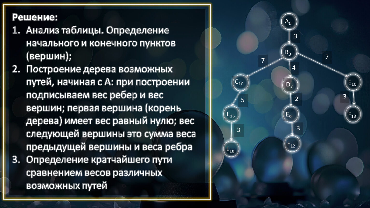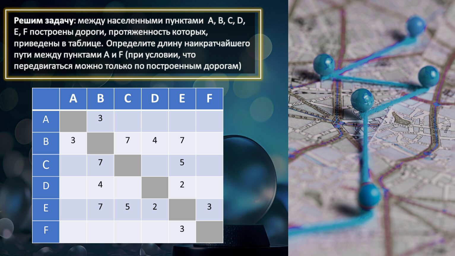 Решим задачу: между населенными пунктами A, B, C, D, E, F построены дороги, протяженность которых, приведены в таблице. Определите длину наикратчайшего пути между пунктами A и F (при условии, что передвигаться можно только по построенным дорогам)