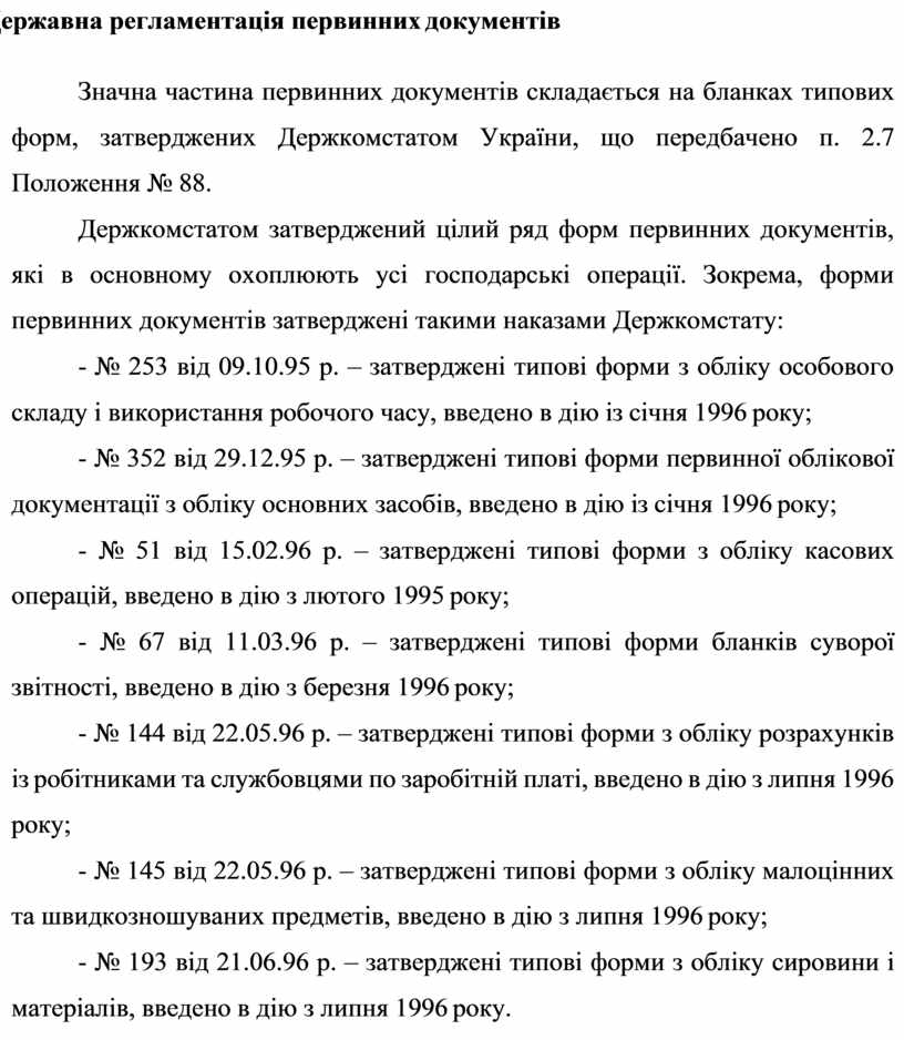 Значна частина первинних документів складається на бланках типових форм, затверджених Держкомстатом України, що передбачено п. 2.7 Положення № 88.