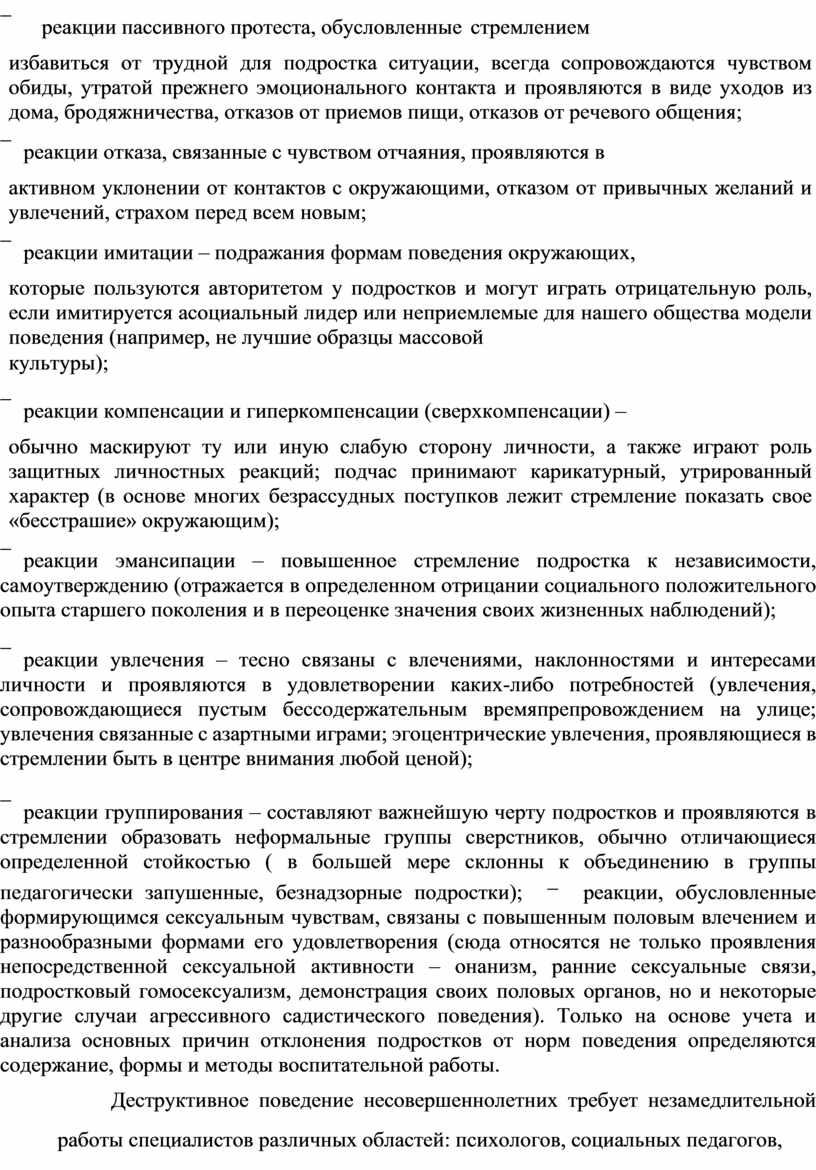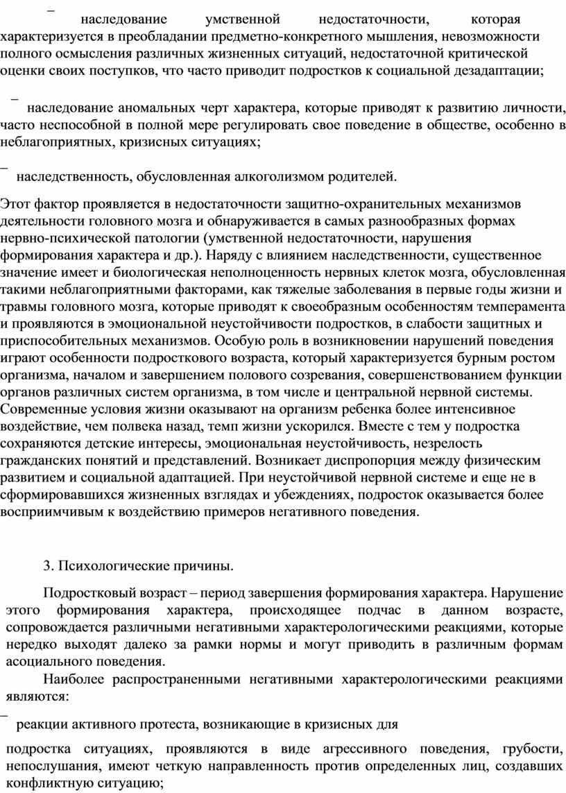 Подростковый возраст – период завершения формирования характера. Нарушение этого формирования характера, происходящее подчас в данном возрасте, сопровождается различными негативными характерологическими реакциями, которые нередко выходят далеко за рамки нормы и могут приводить в различным формам асоциального поведения.